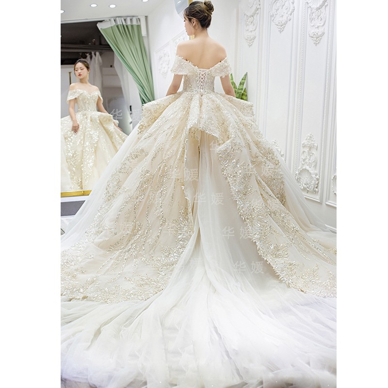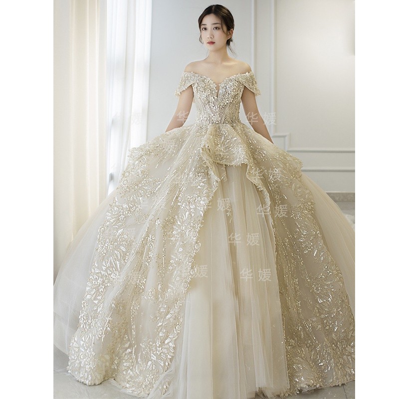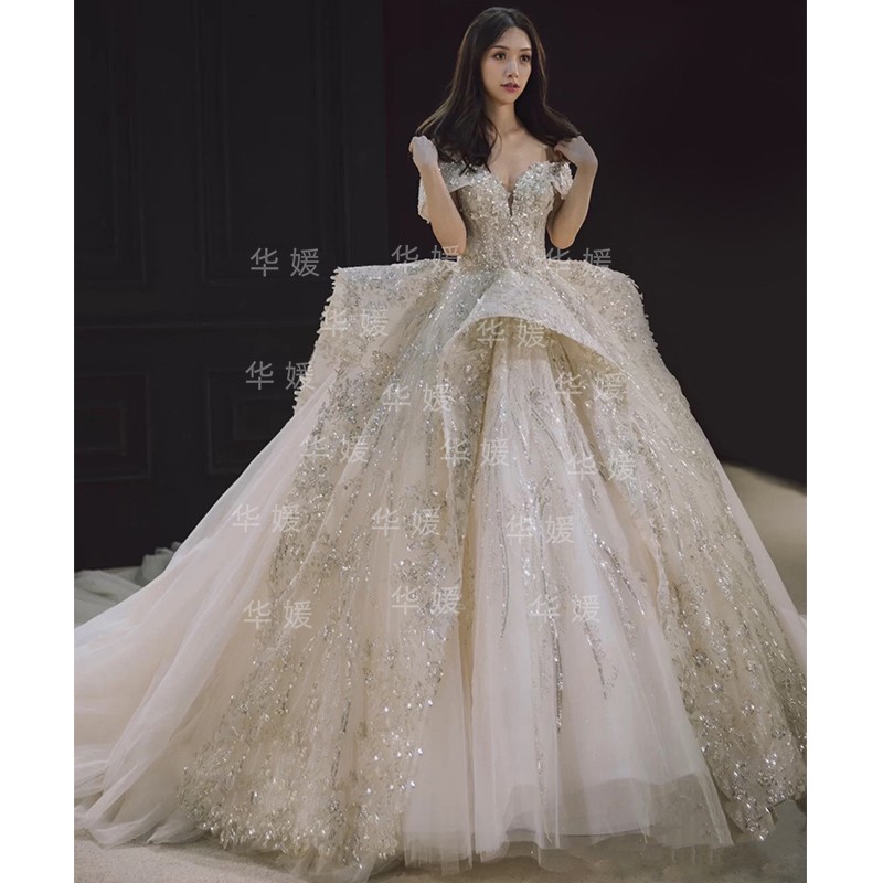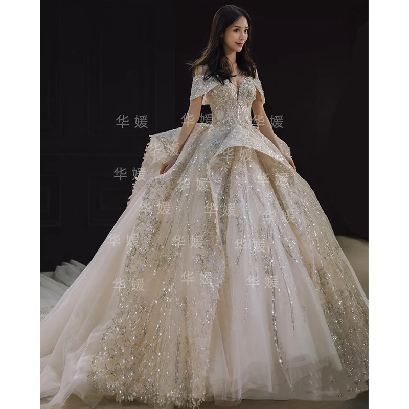 Main wedding dress 2021 new big drag exhaust gas bride heavy industry 2020 starry sky French light summer one shoulder