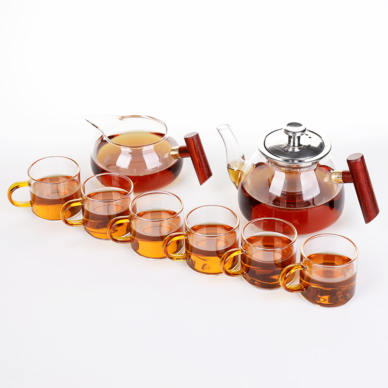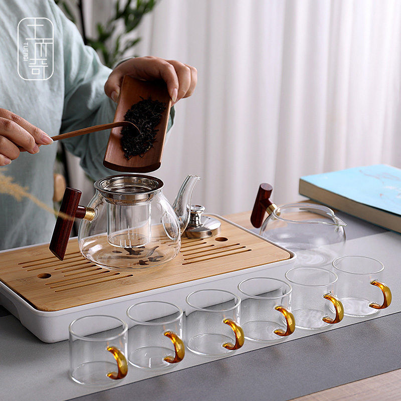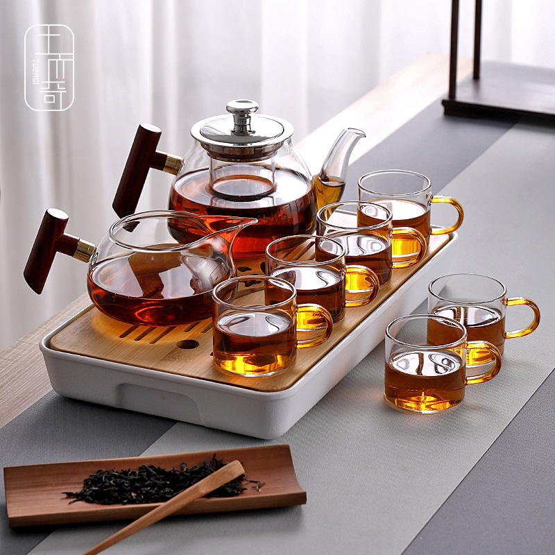 Tuerqi heat-resistant glass tea set set household wooden handle pot wooden handle fair cup kung fu tea set complete teapot - Taobao