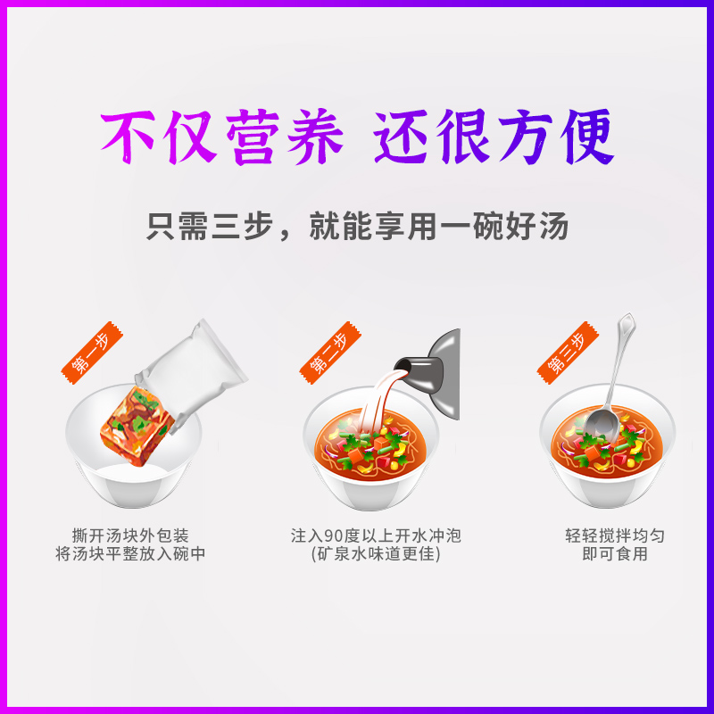 Purple Vegetable Egg Soup 8g * 30 Pack spinach Egg Soup 8g * 30 Tomato Egg Soup 8g * 30 Mushroom Egg Blossom Soup 8g * 30 Sour Spicy Soup 8g * 30 Package