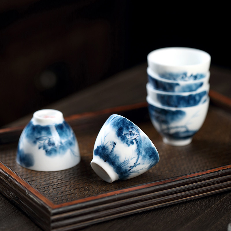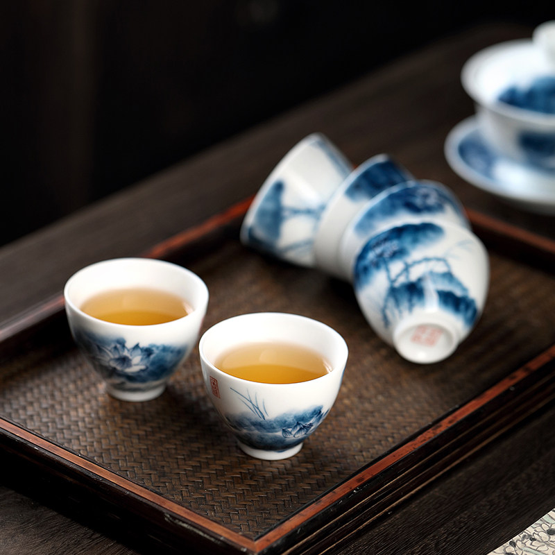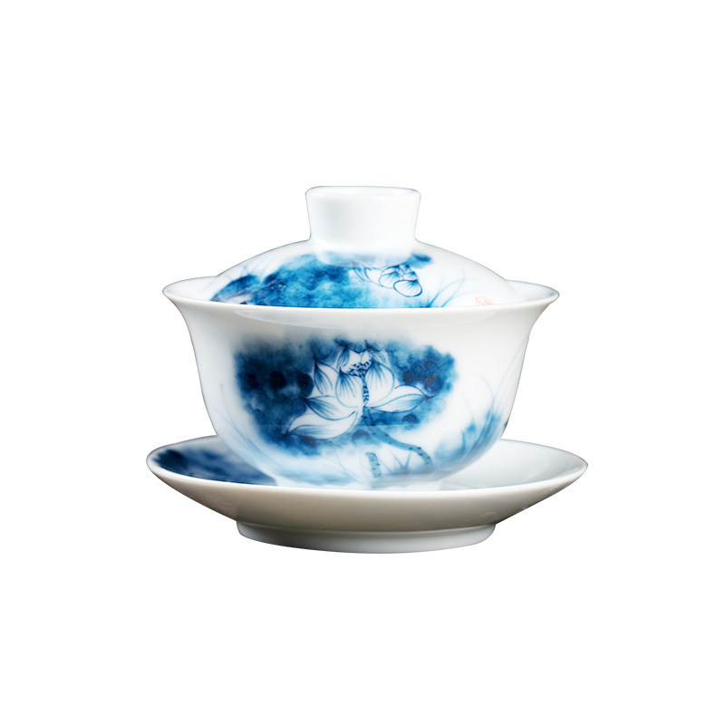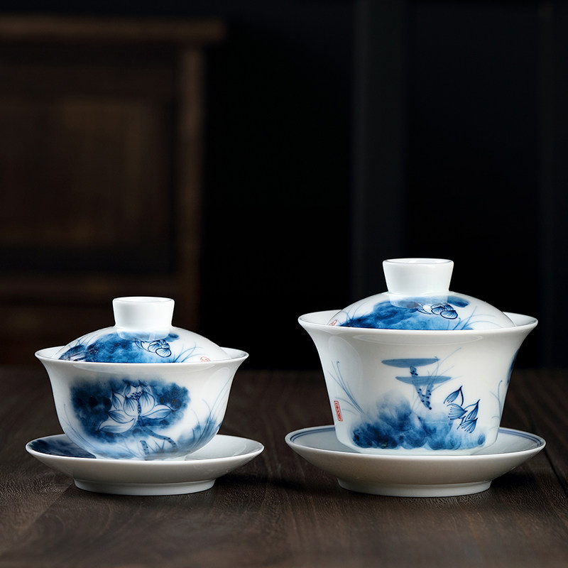 Hand-painted lotus ceramic kung fu cover bowl tea cup home drinking tea tea cup blue and white tea set tea three talents bowl set