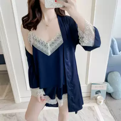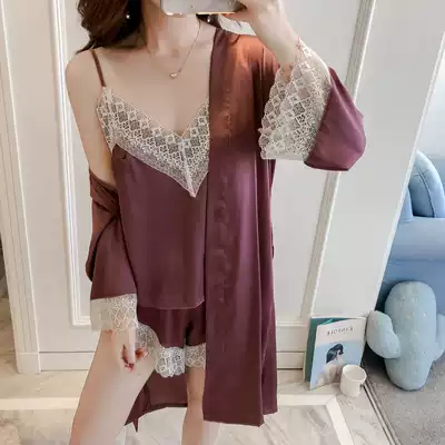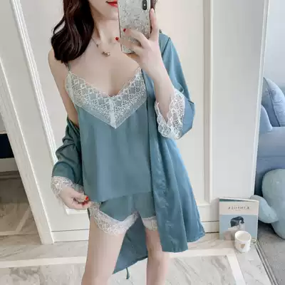 Sexy pajamas female Summer Ice Silk three-piece set thin hot provocative feminine lace sling silk robe