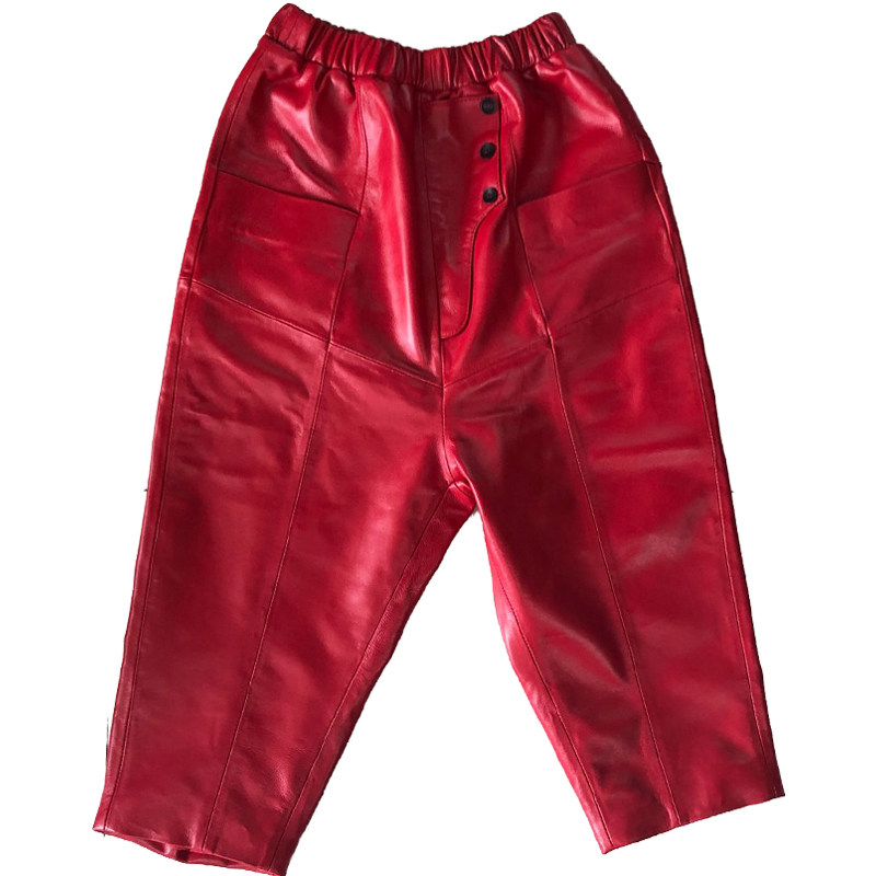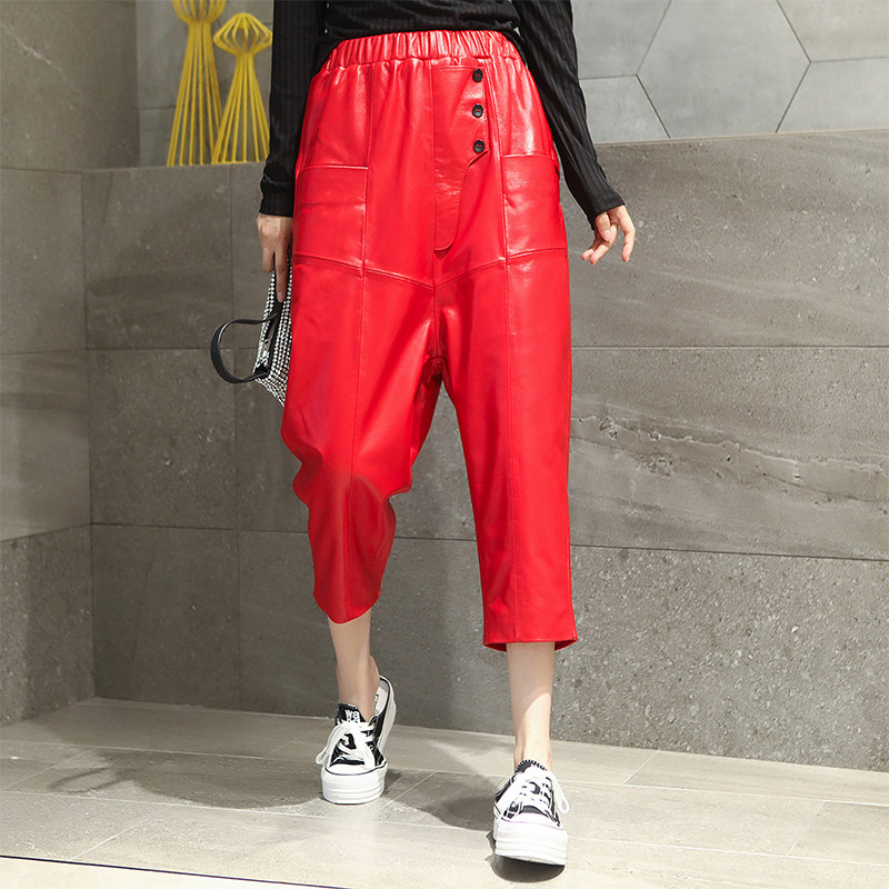 Early spring new sheepskin seven-point casual harem pants leather large size loose baggy pants new high waist pure leather big crotch pants