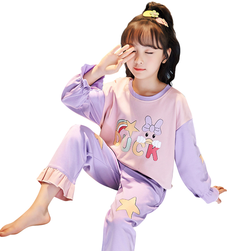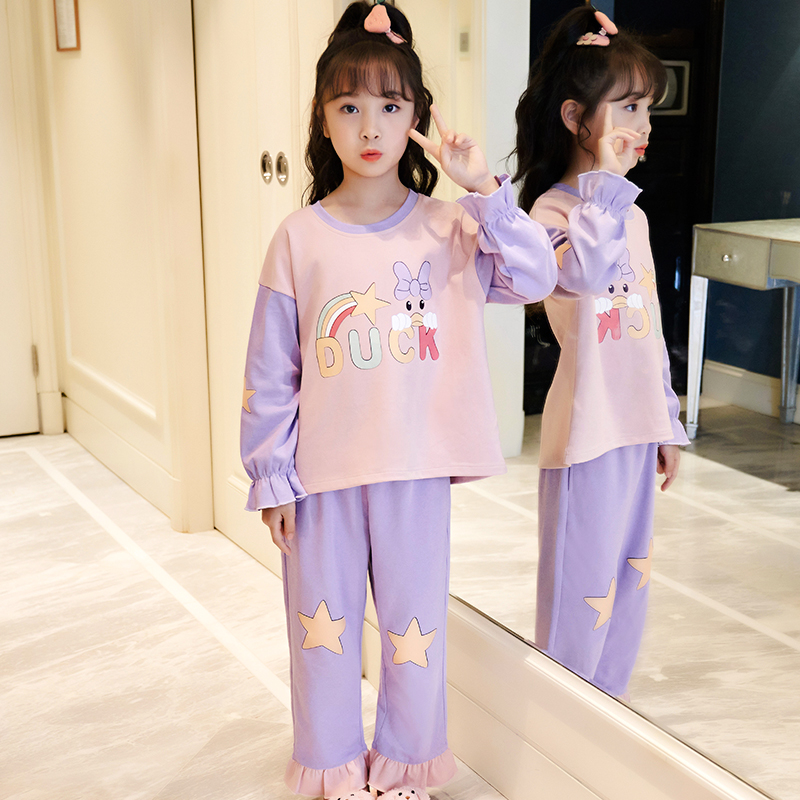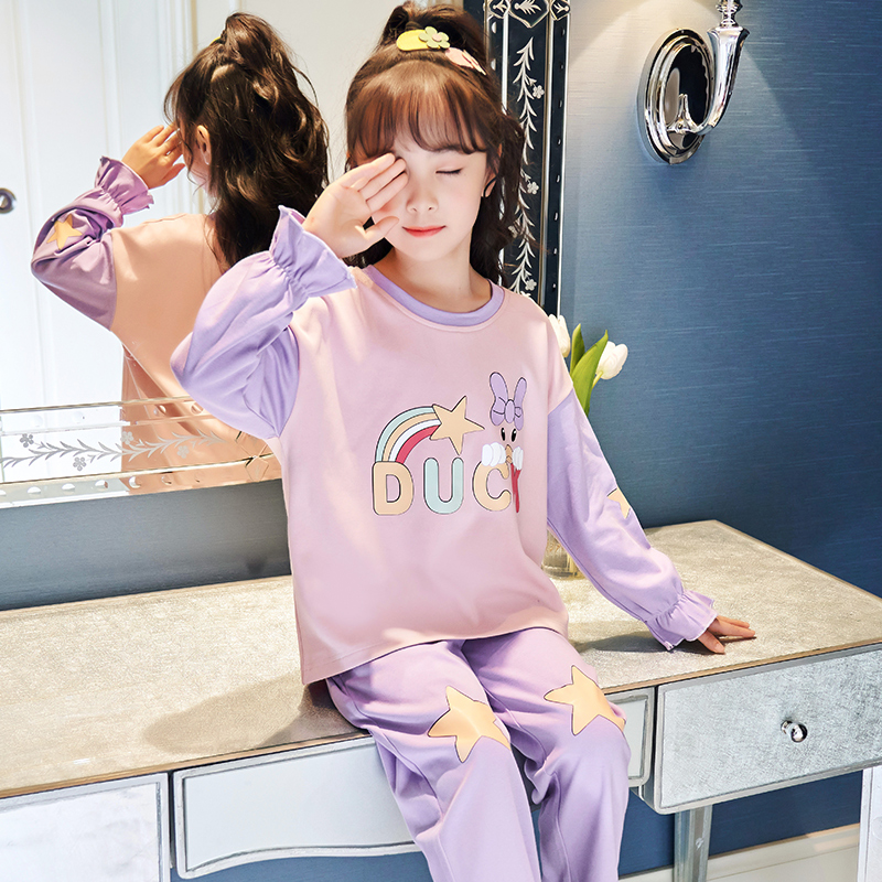 Girls pajamas spring and autumn long-sleeved cotton children's thin summer day children's home clothes Children rainbow duck suit