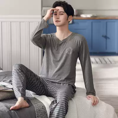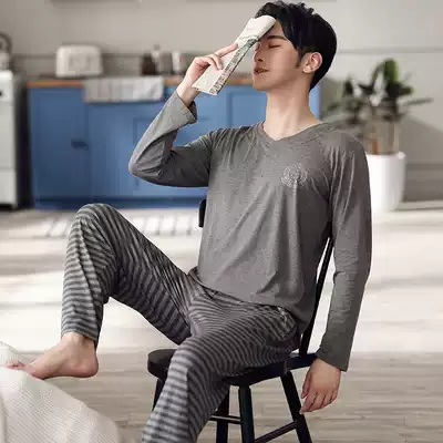 Men's pajamas Spring and Autumn modal long-sleeved loungewear suit Ice silk middle-aged large size autumn and winter autumn