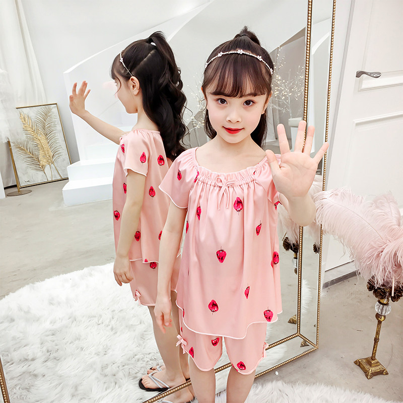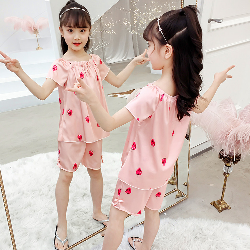 Girls Pajamas Summer Thin Ice Silk Children's Short Sleeve Set Simulation Silk Spring and Autumn Home Clothes Suspension Air Conditioning Clothing