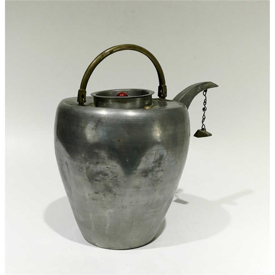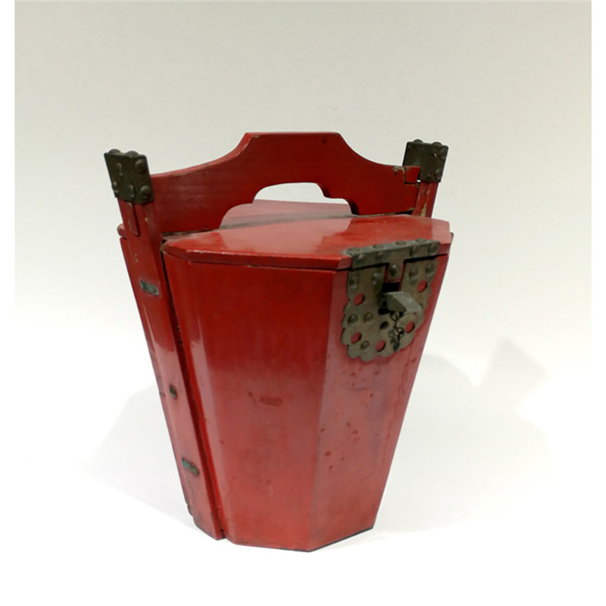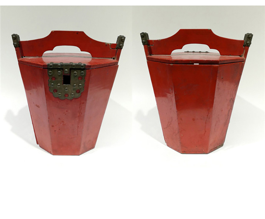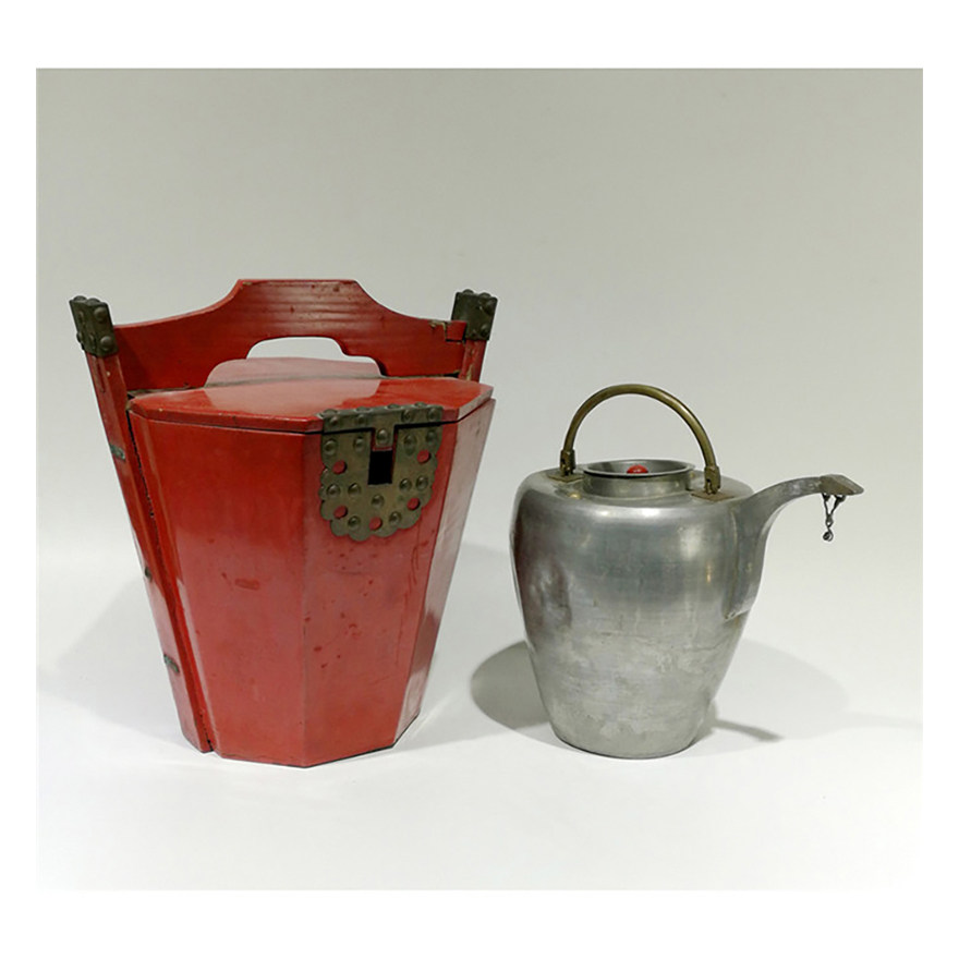 Fun Collection] Meiji period eight-sided wooden tire vermilion lacquer copper live suitcase tin old wine kettle