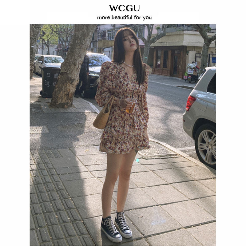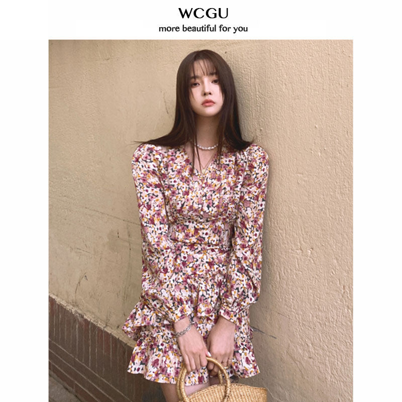 Long-sleeved floral chiffon dress V-neck square shoulder ruffle 2020 new autumn women French retro waist