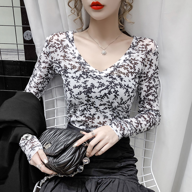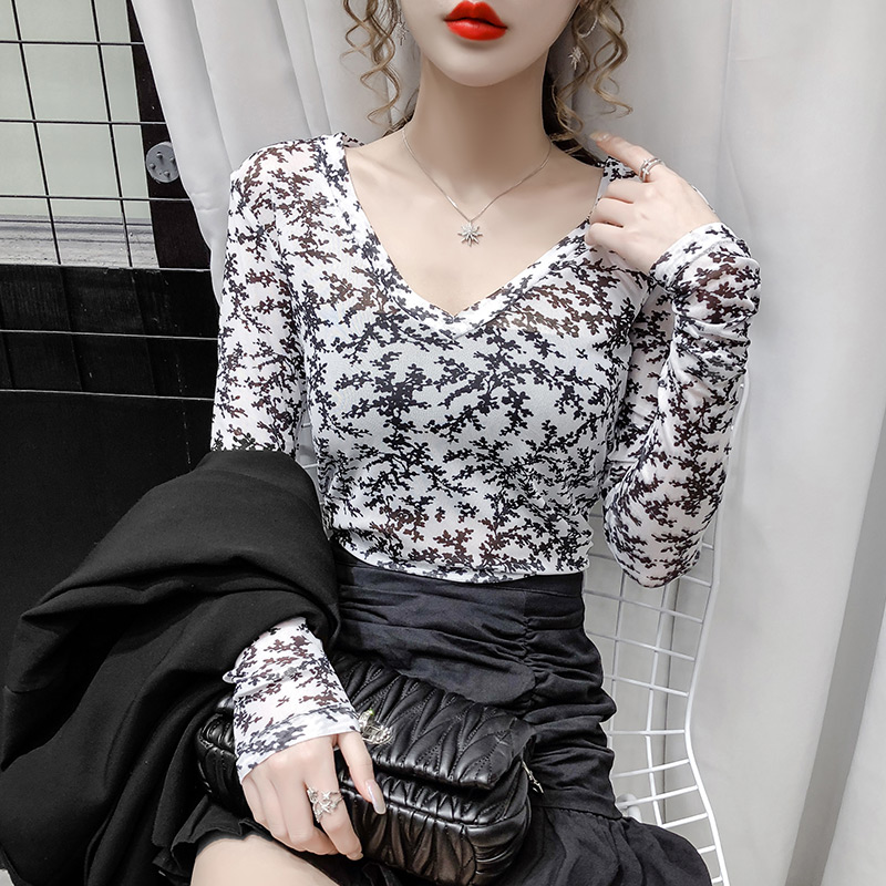Collarbone Ice Silk T-shirt Woman 2022 Summer New sunscreen Ins Chains Chains Damp Slim long sleeves Broken Flowers V collar blouse