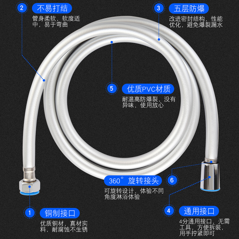 (10-year warranty)Silver 1 5-meter explosion-proof tube three-way booster shower nail-free wall seat