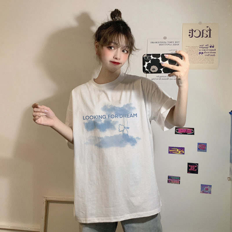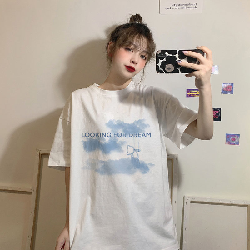 Short sleeve t-shirt woman 2021 Summer round collar loose medium long version Korean version 100 hitch short sleeve printed blouse surge