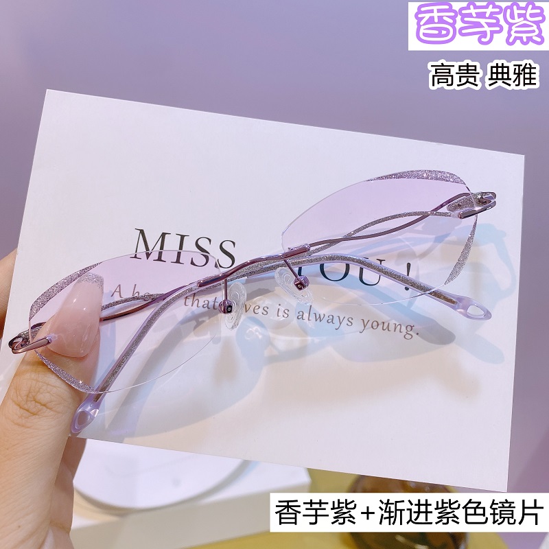 Frameless glasses myopic women can be equipped with height number plus astigmatism anti-fog diamond cut edge borderless color change anti-blue light