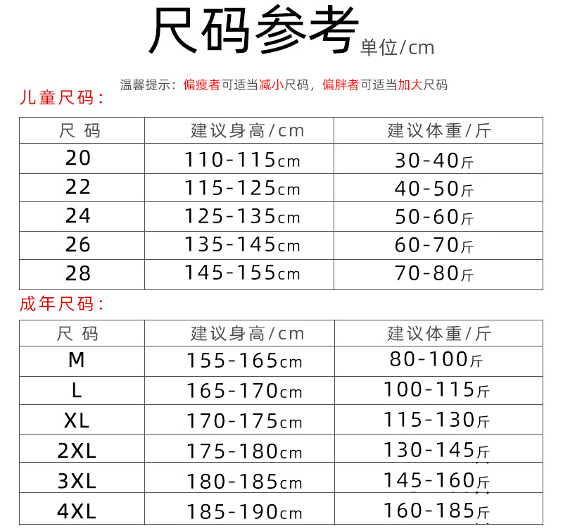 20 (height 100-115cm weight 30-40 catties) 22 (height 115-125cm weight 40-50 catties) 24 (height 125-1