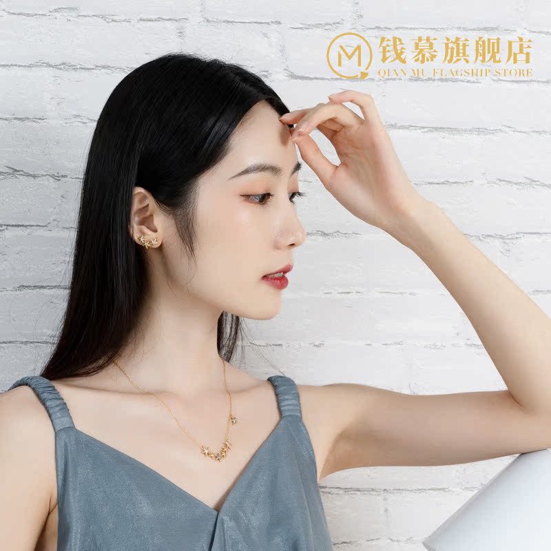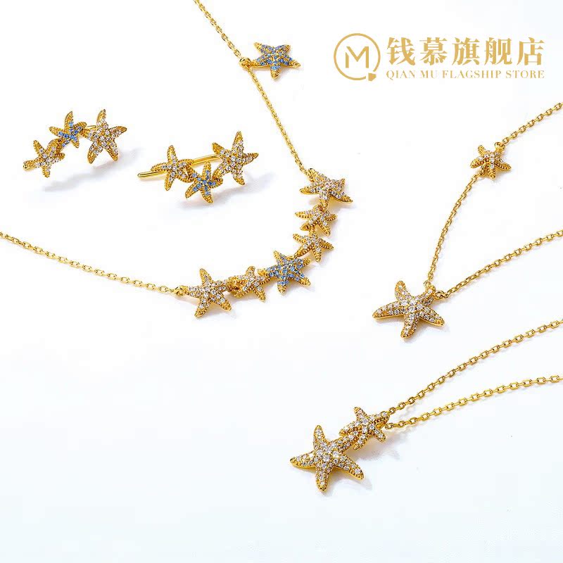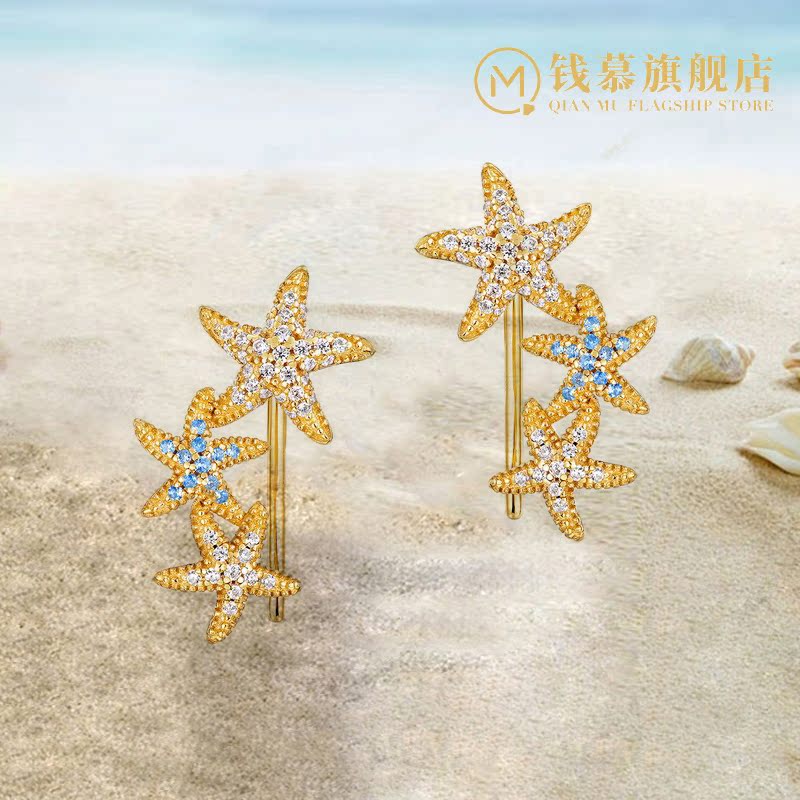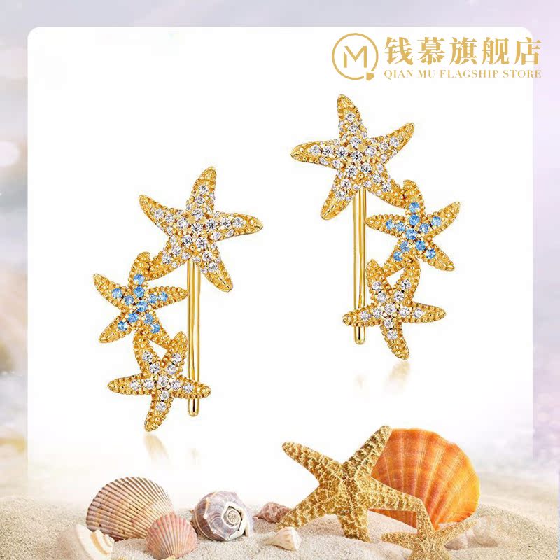 Qianmu gold-colored starfish imitation diamond earrings S925 sterling silver gold-plated personality cute and oblique wearable earrings