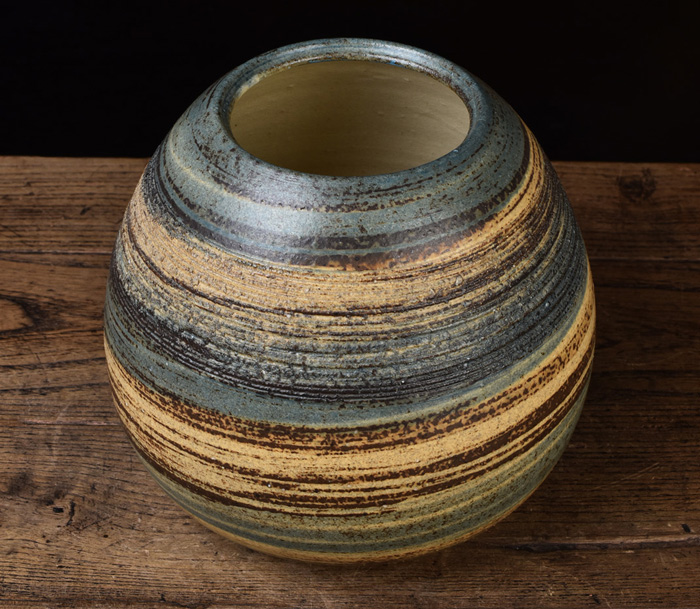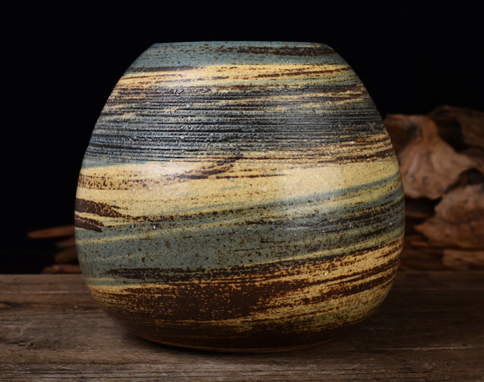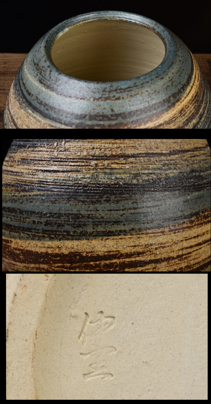 Pottery Porcelain-R02-Japanese Period Items-Shigaraki Ware-Extended Kiln-Colorful Dark Engraved Spiral Pattern Old Vase 20cm