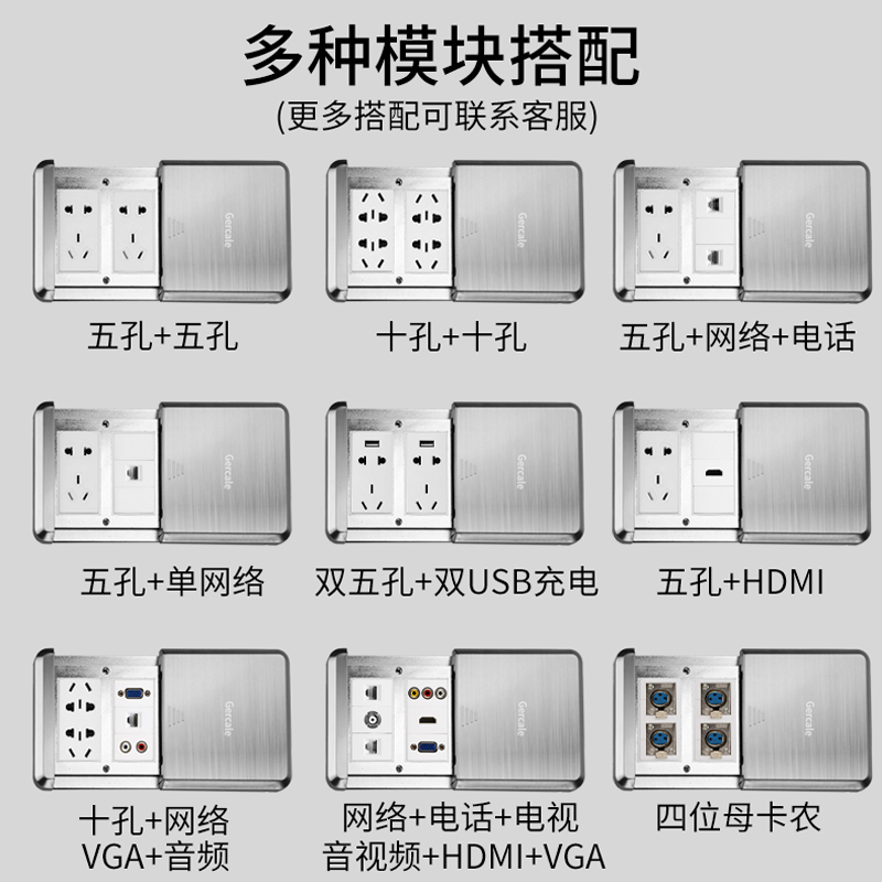 Dual five-hole double ten-hole double five-hole with switch control Five-hole + network + telephone Five-hole + single network Double 16A five-hole Five-hole + network + telephone + TV Four-hole + HDMI HD Five-hole + VGA + network + audio Five-hole + VGA + audio + HDMI Four-digit mother canon
