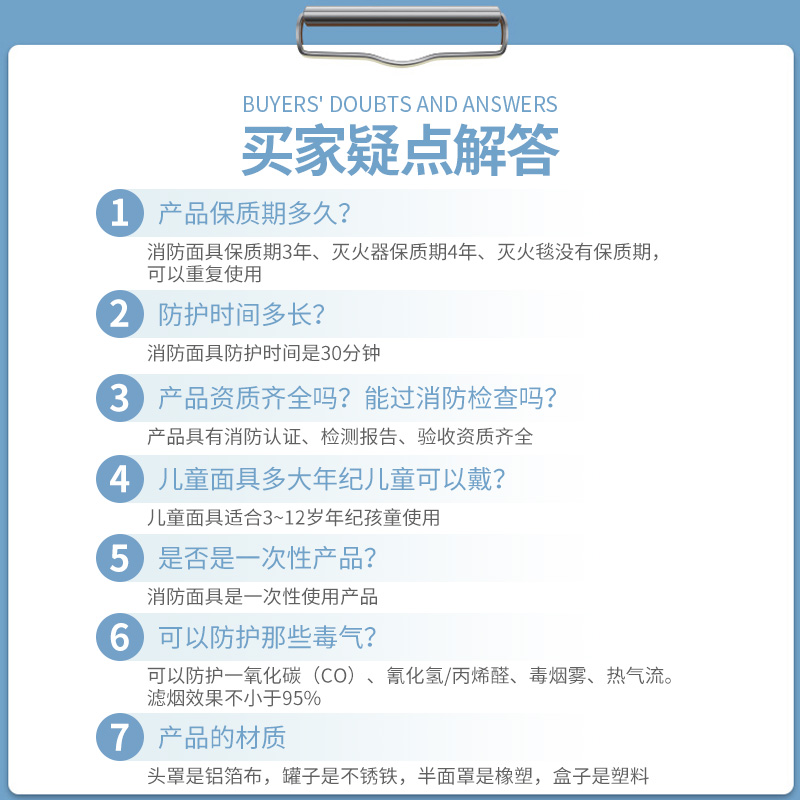 3 fire masks + 1 children's mask + 2 1.5 meter fire blankets + 1 water-based fire extinguisher