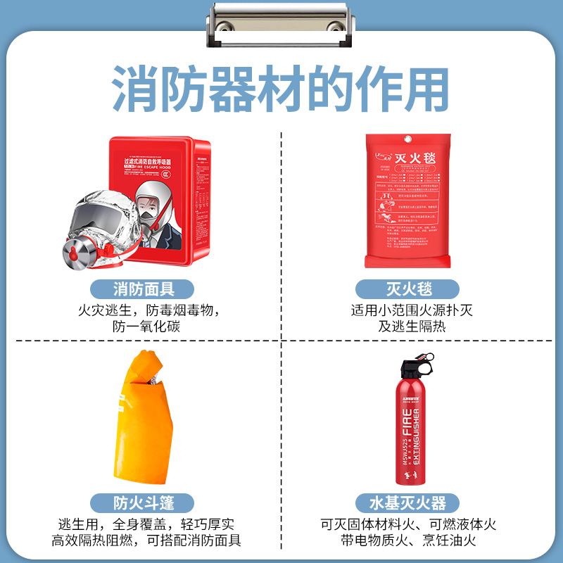 1 fire mask + 1.2 meter fire blanket + 1 water-based fire extinguisher