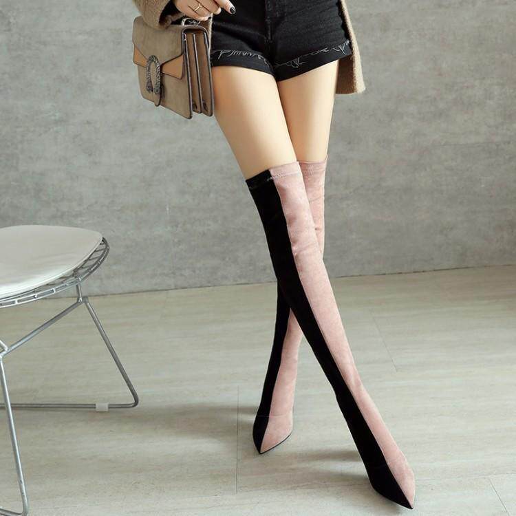 Over-the-knee boots women's elastic and thin leather 2022 autumn and winter stovepipe boots do not fall off the tube pointed toe thick heel color matching