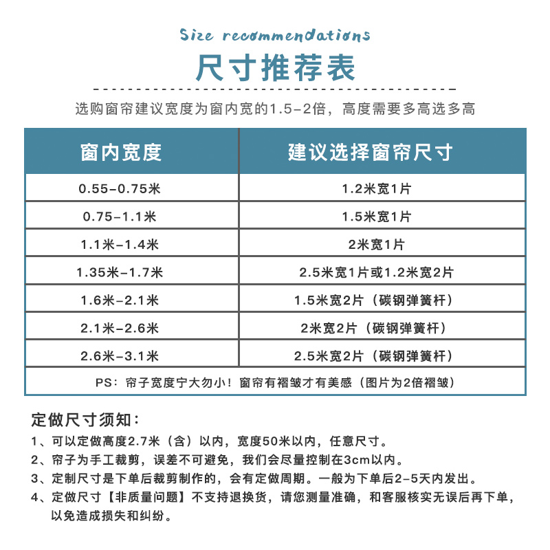 Curtain width 1 2* height 1 5m (for window width 55-75cm) for free S rod Curtain width 1 2* height 1 8m (for window width 55-75cm) for free S rod Curtain width 1