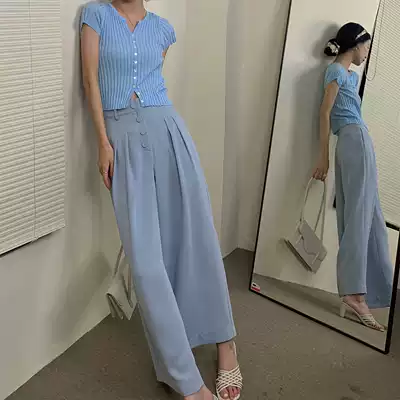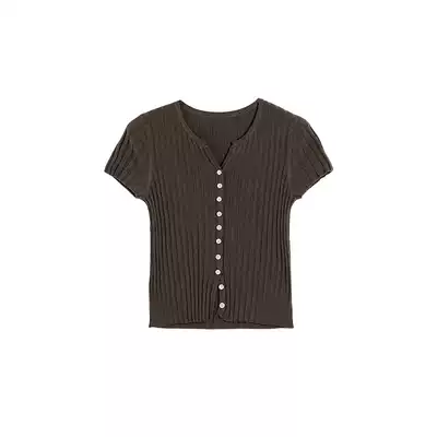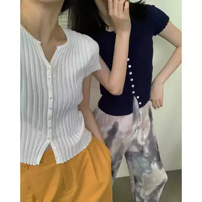 Luqing Yikeng strip knitted button T-shirt autumn new temperament is thin V-neck slim short-sleeved casual top women