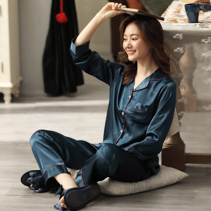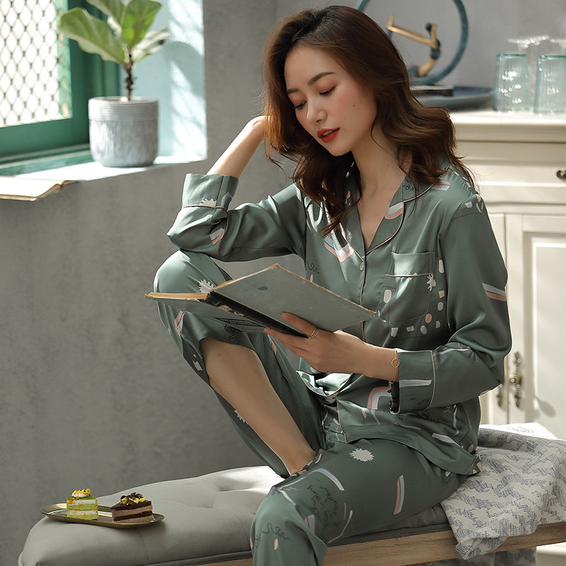 Sleepwear Women Spring Autumn Ice Silk Long Sleeve Lovers Thin summer emulated silk autumn winter can go out home Two-style suit