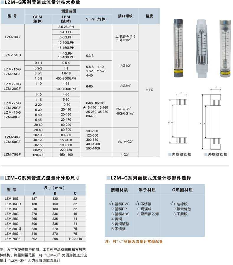 Liquid 6-60GPM 20-240LPM inner wire 1 5 inch liquid 20-170LPM plastic outer wire 1 5 inch liquid 15-150LPM plastic