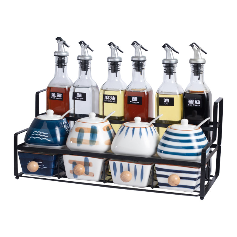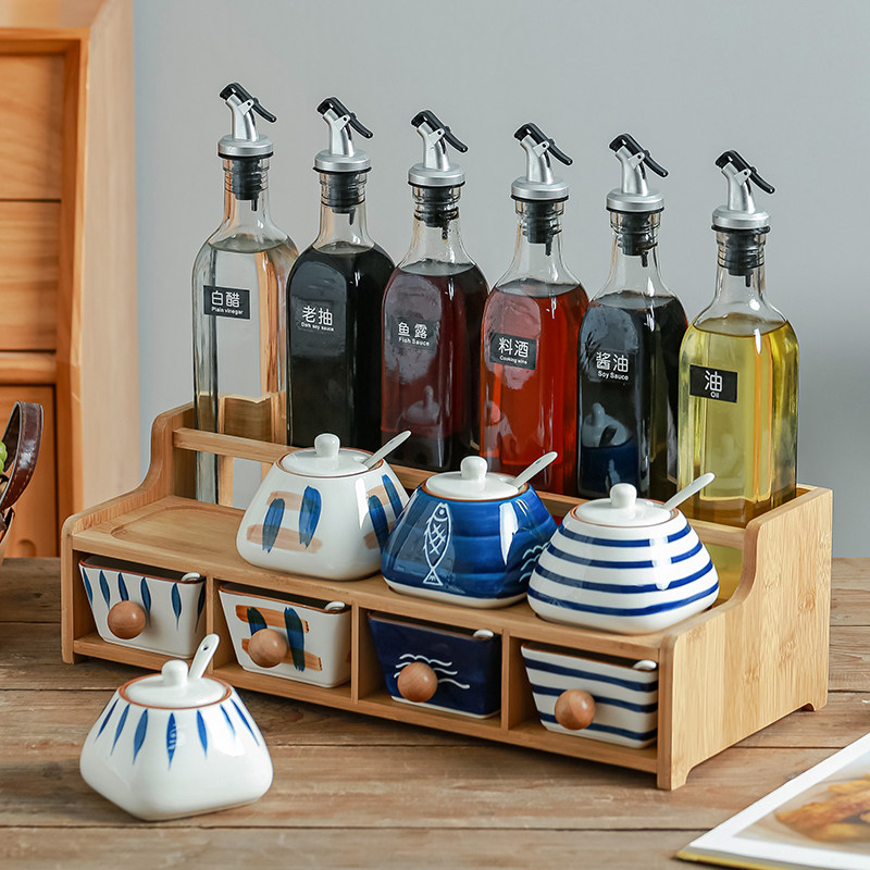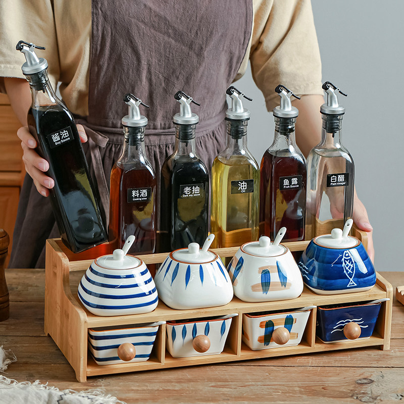Japanese seasoning box set Household seasoning tank Seasoning tank rack Oil bottle pot Salt tank Glass kitchen supplies shelf