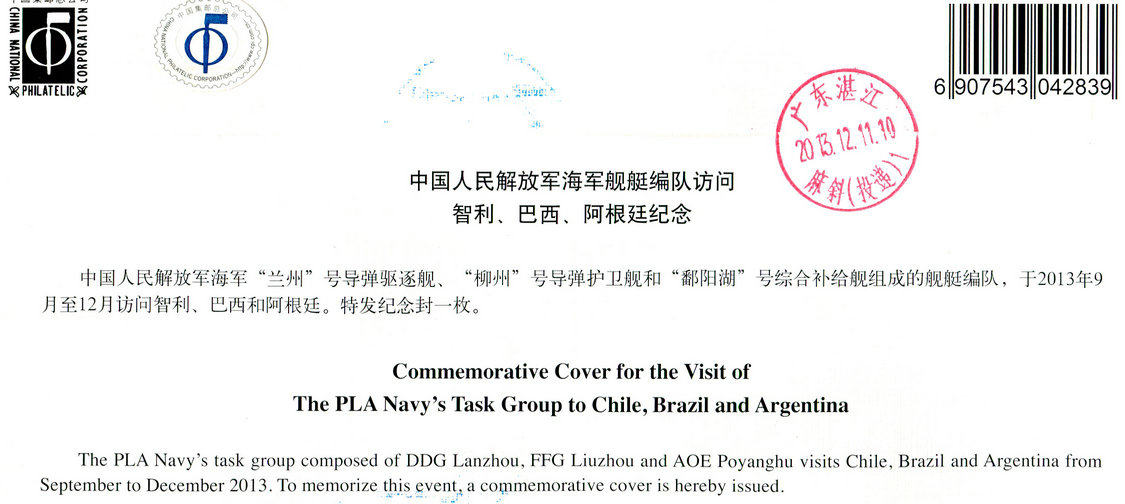 Hai-65 Chinese People's Liberation Army Navy Ship Formation Visits Chile, Brazil, Argentina, Commemorative Envelope