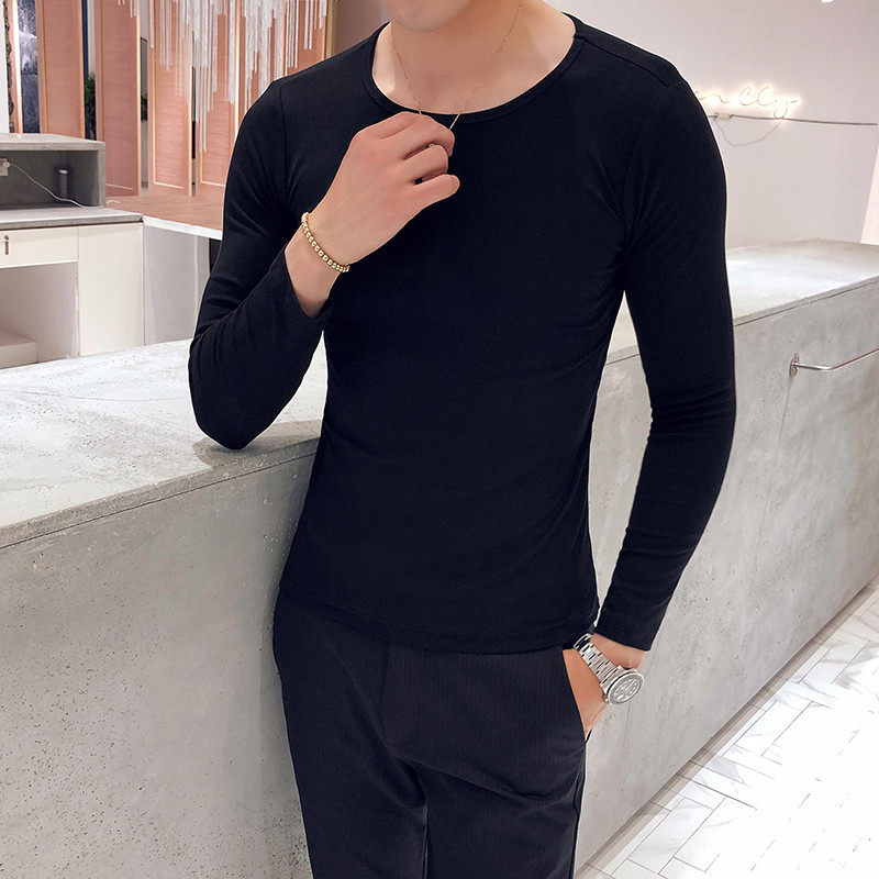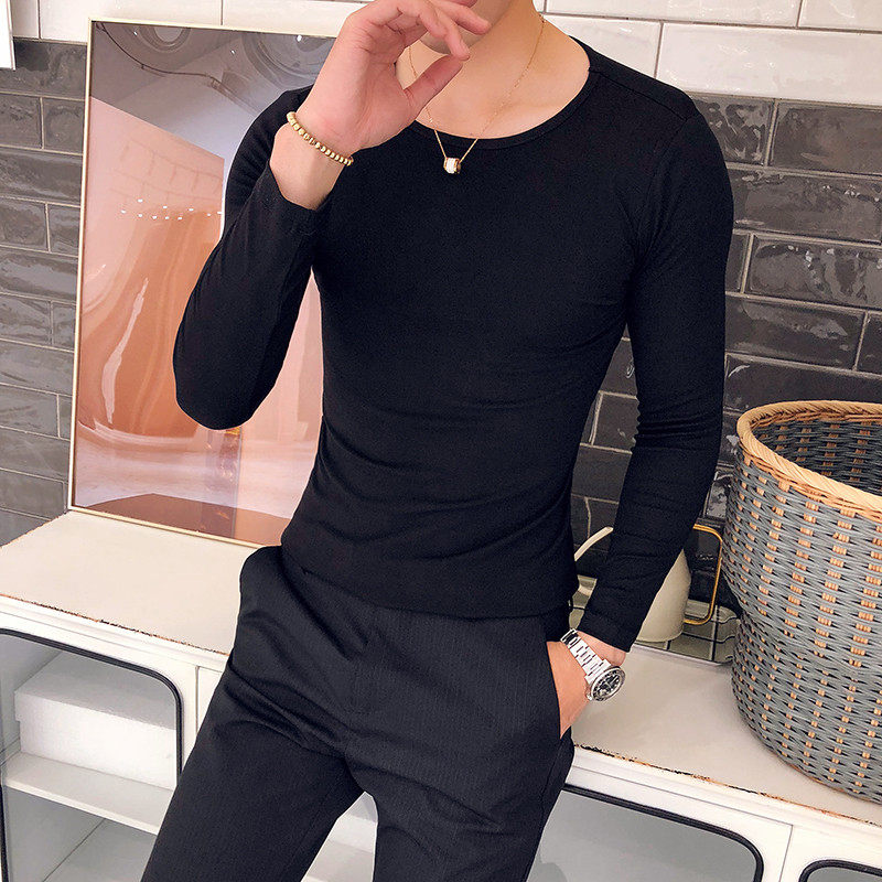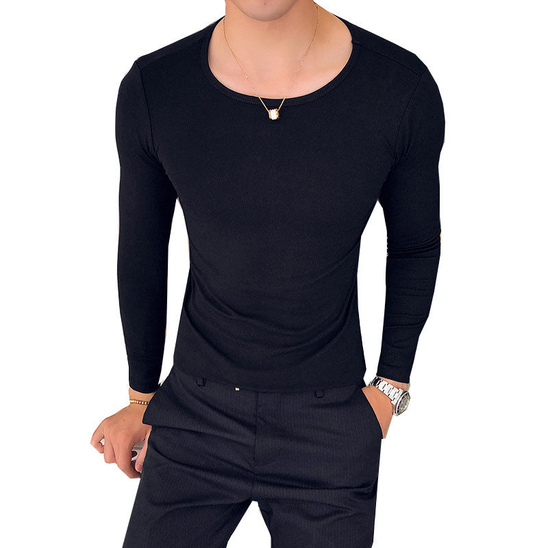 Personality men's long-sleeved T-shirt Trendy men's solid-color T-shirt Big round collar base long-sleeved T-shirt solid-color wild slim-fit thin