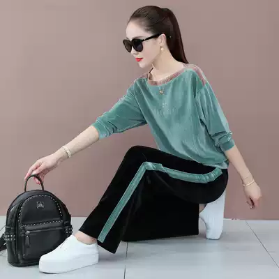 Foreign style golden velvet suit female 2021 Spring and Autumn new fashion wide leg pants European station leisure sportswear two-piece set