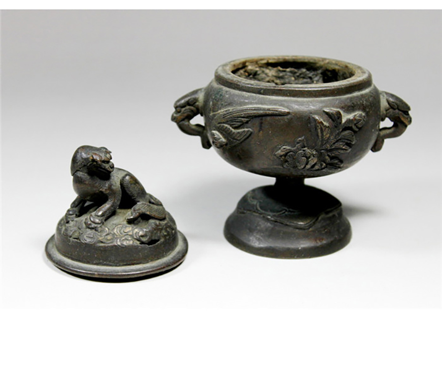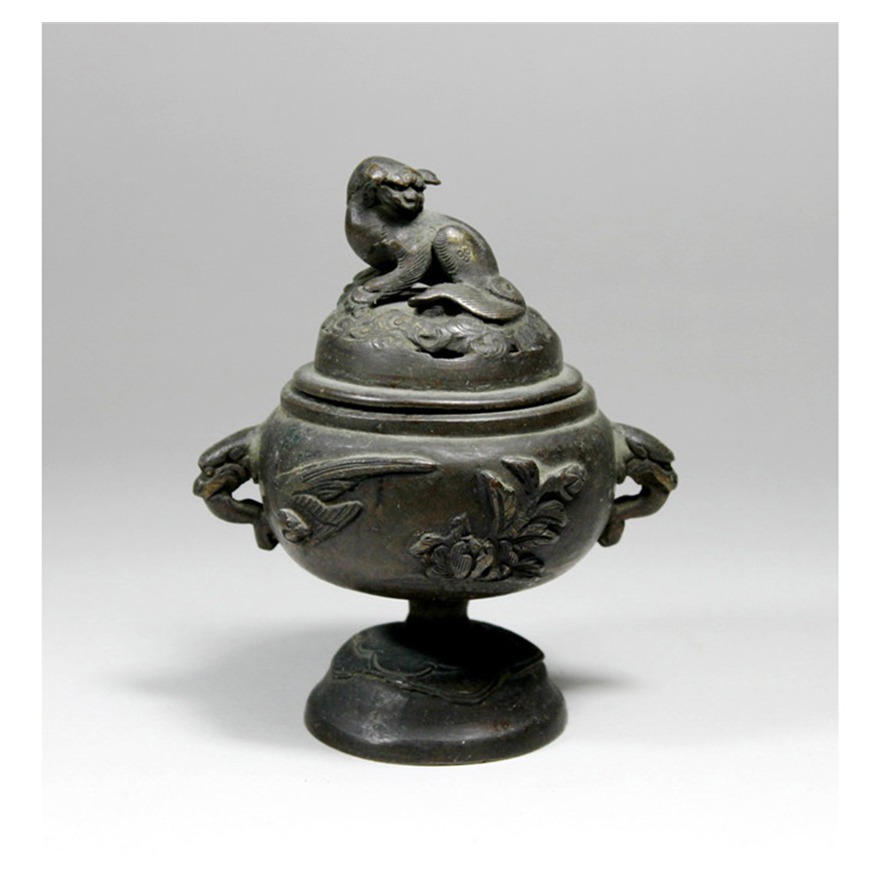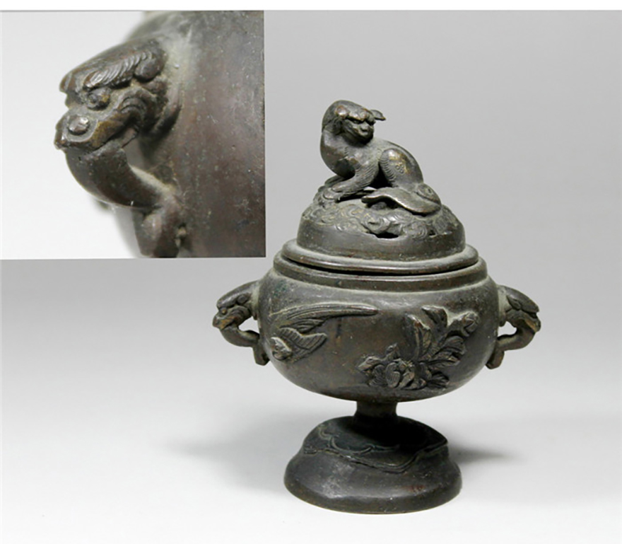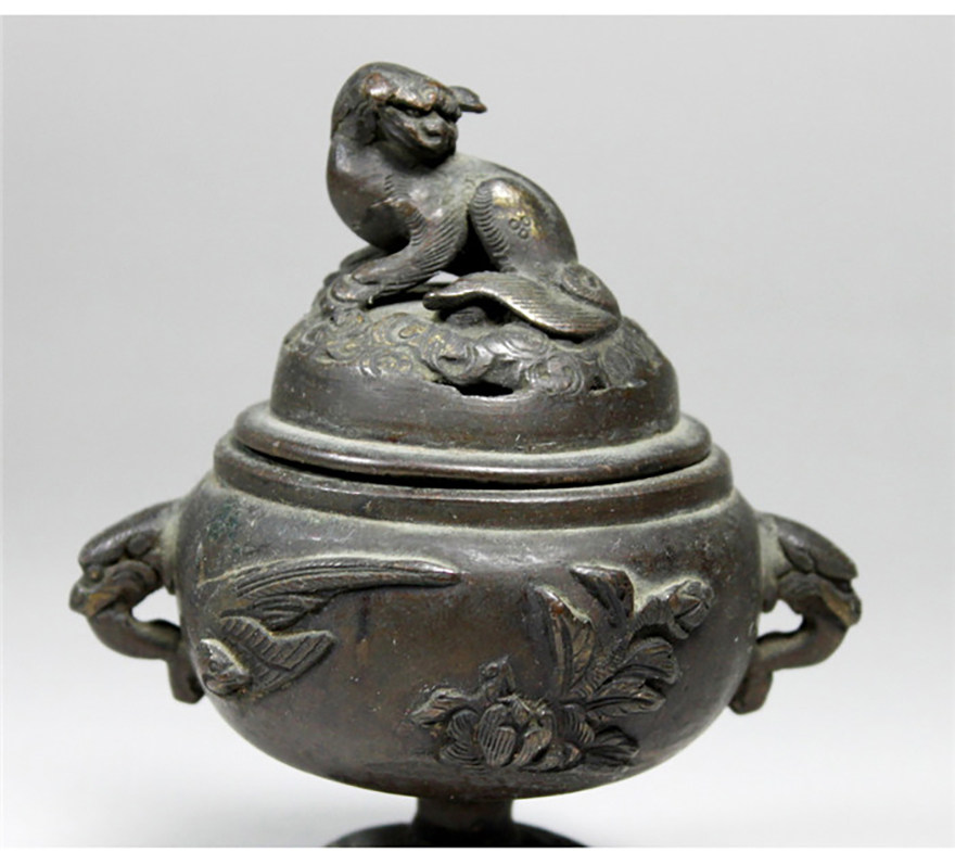 Fun Collection] Meiji early red copper Lion button Chisel Cockatoo Bird Tangling and Bronze Incense Burner