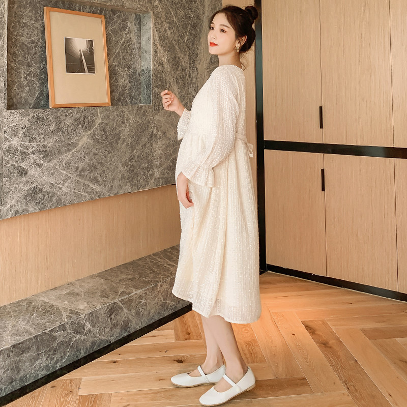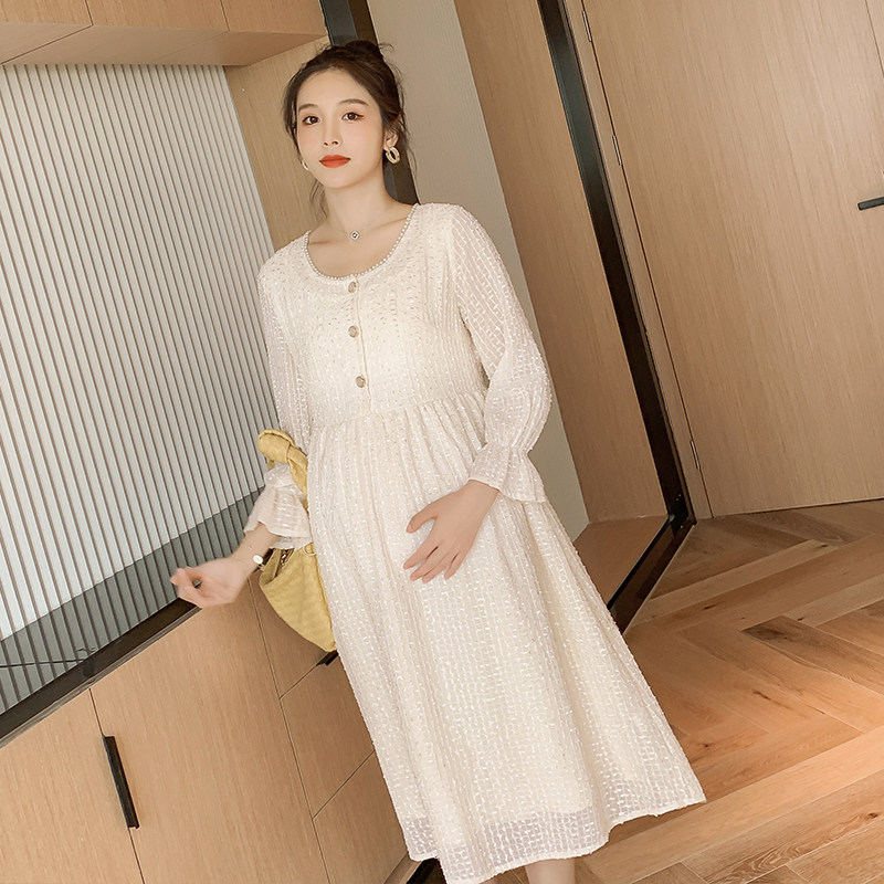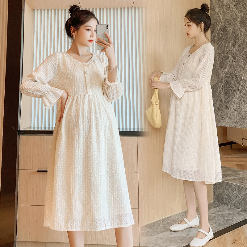 Pregnant Woman Spring Dress Long Sleeve Blouse Spring Pregnant Woman Skirt Mesh Red Fashion with a knee cover Relaxed Temperament Foreign Dress