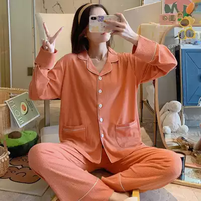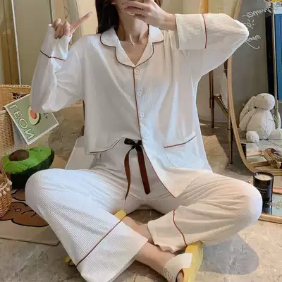 Pajamas women's spring and autumn long-sleeved cotton thin Korean version of sweet and cute simple solid color casual cardigan pit strip home clothes