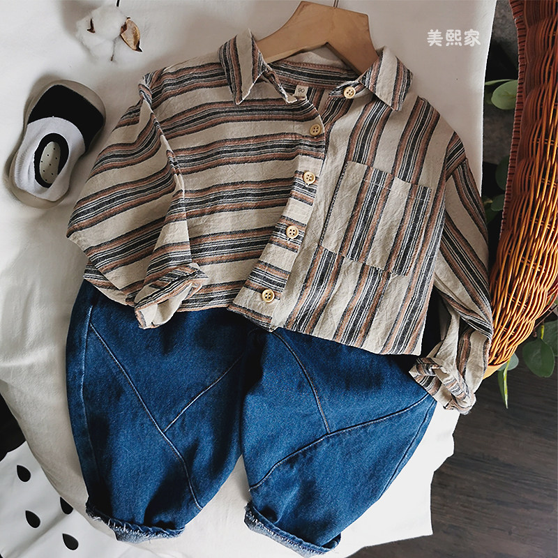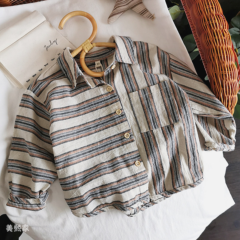 Art Van ~ 2020 Fall new Korean version Children's baby shirt cotton linen irregular striped male and female child jacket