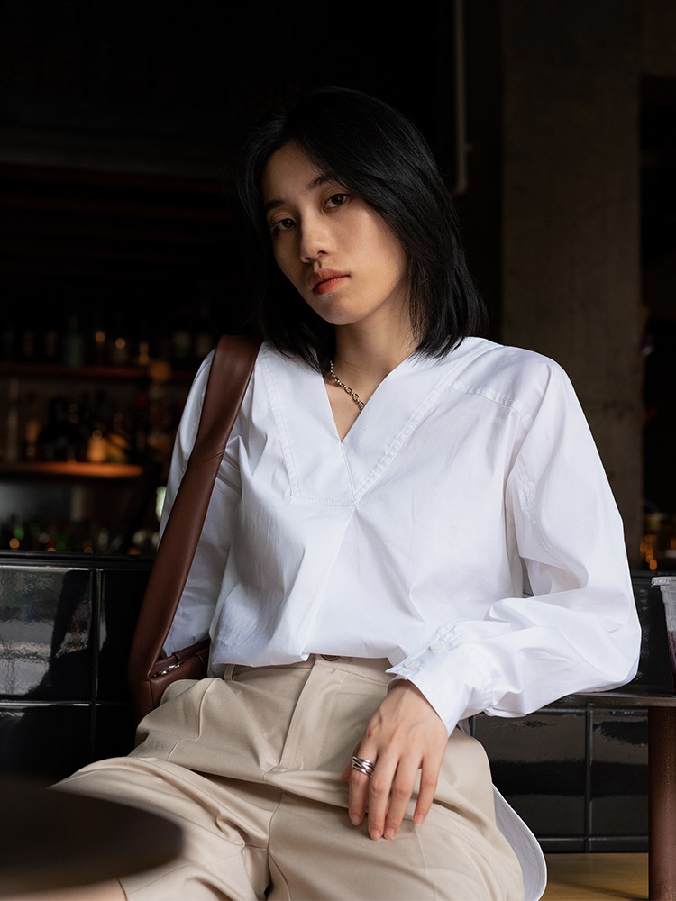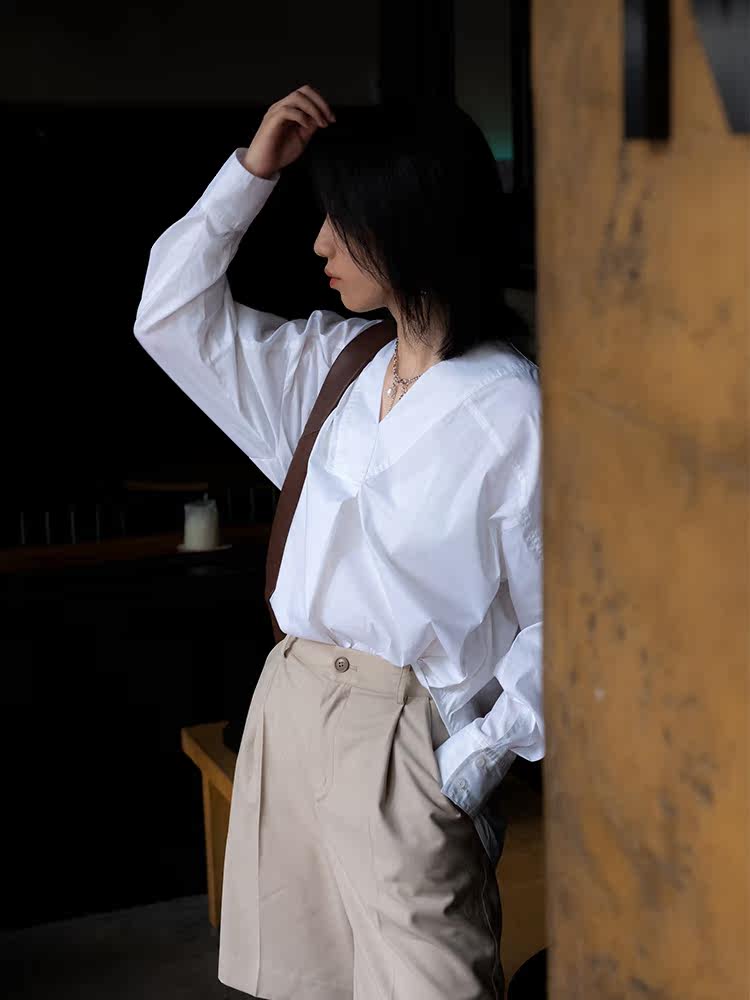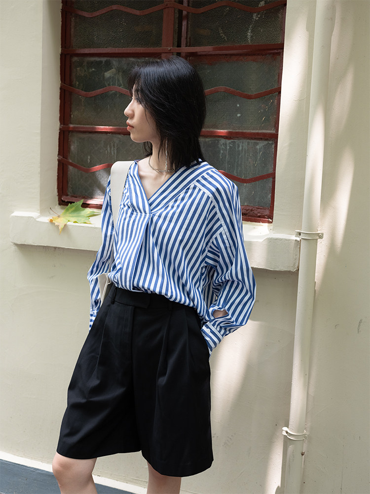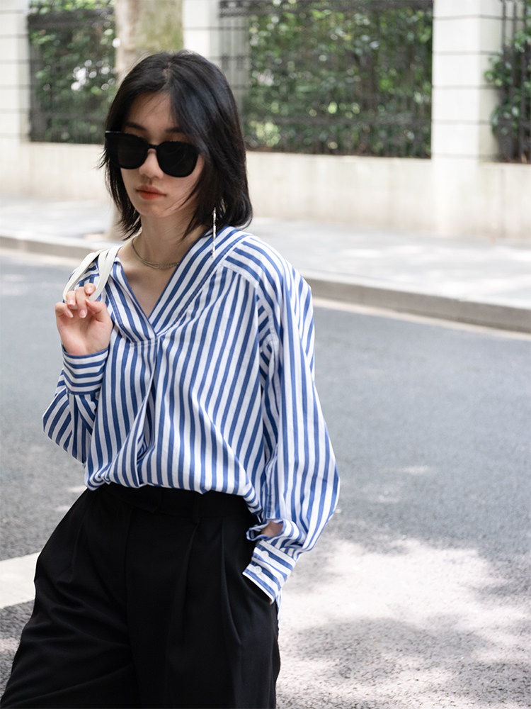 GUOE 20AW V-neck striped loose raglan sleeve shirt design sense niche long-sleeved shirt women's outerwear all-match