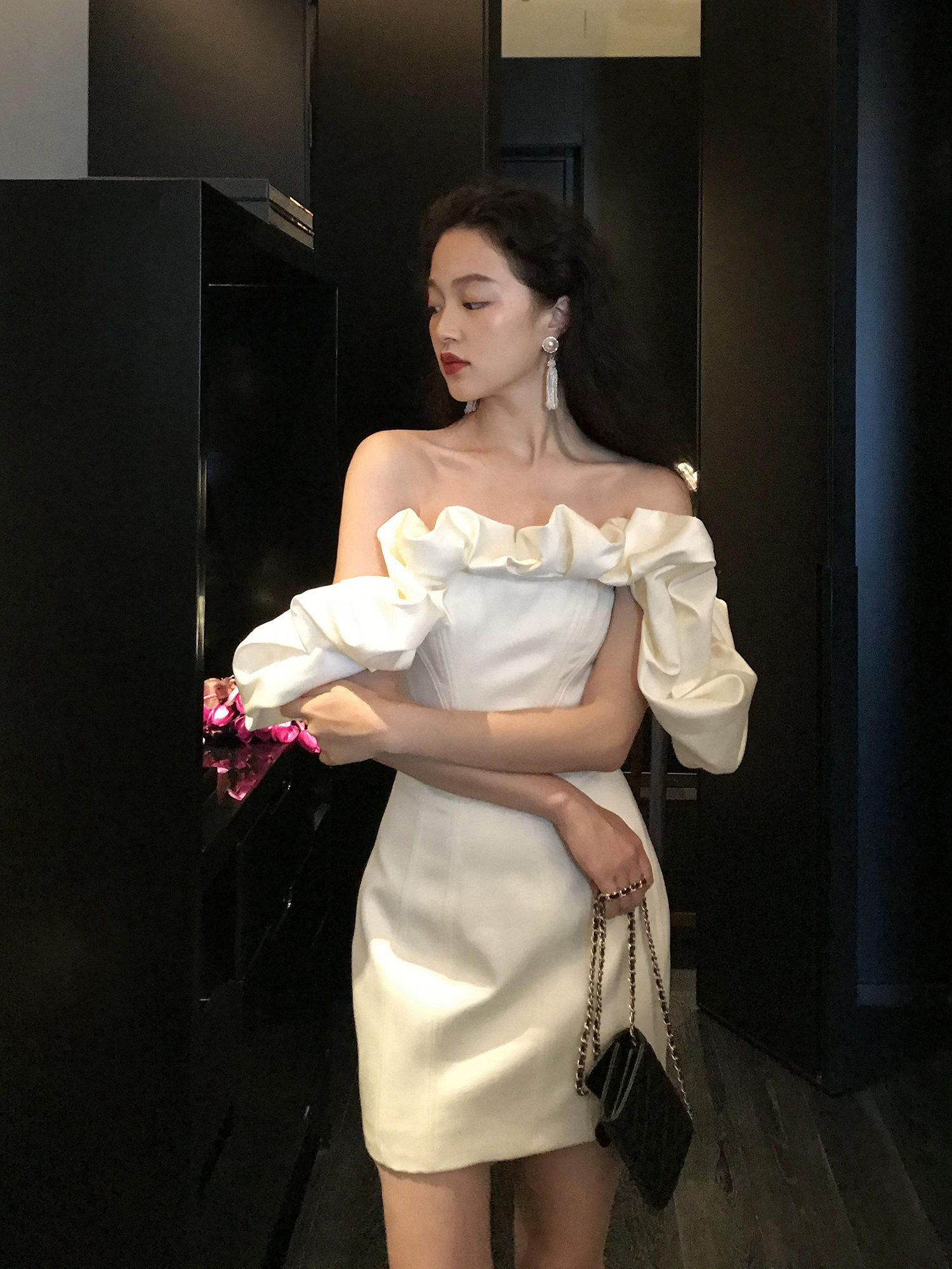 viss gold word shoulder white French retro dress 2020 new summer waist thin temperament dress skirt
