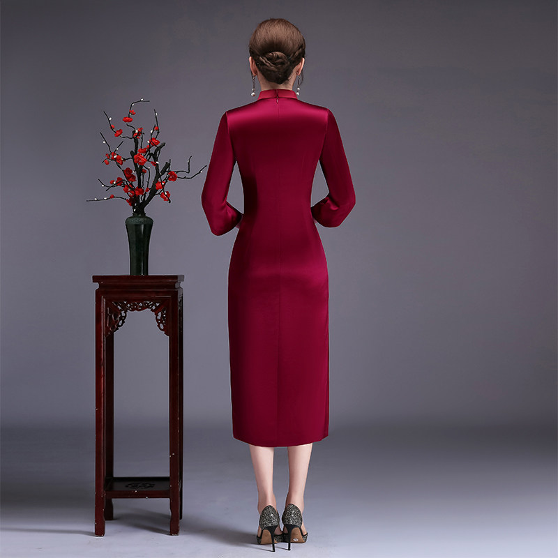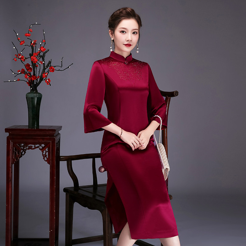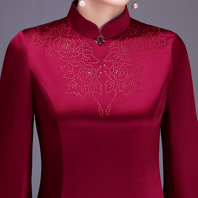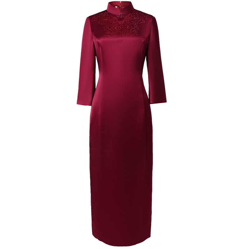 Acetate satin mother dress wedding banquet cheongsam dress noble improved diamond mother wedding dress wine red happy mother-in-law cheongsam