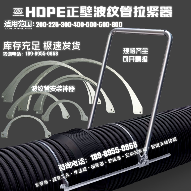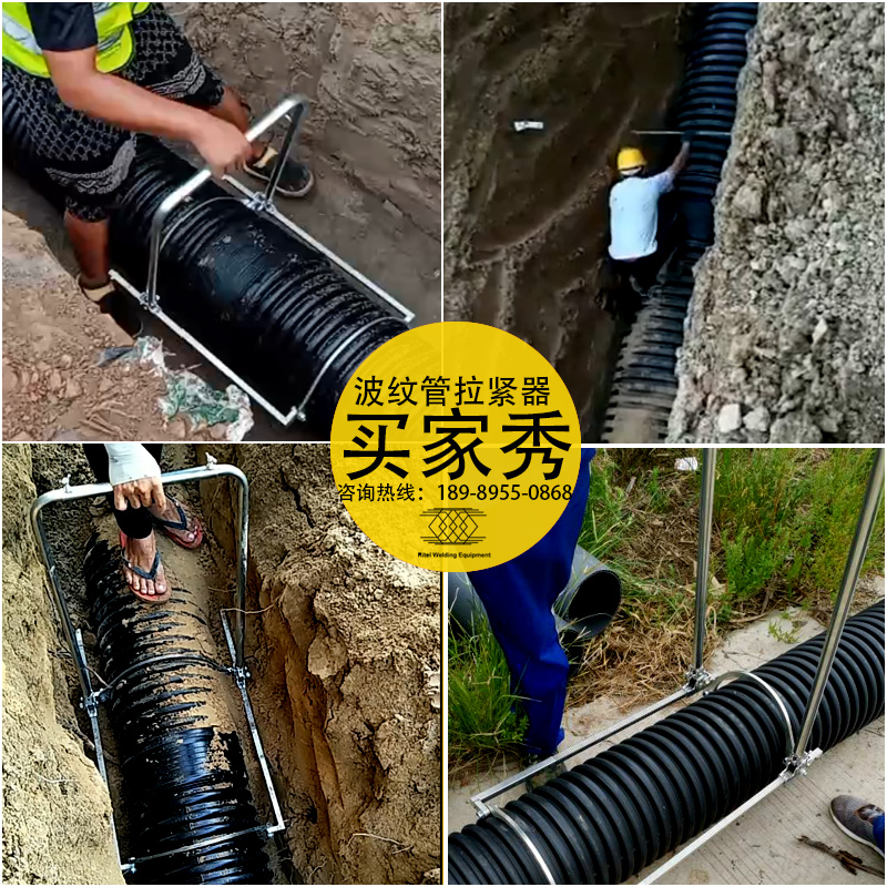 Bellows tensioner pipe puller universal HDPE double wall takeover splicing connection propulsion tool mounting artifact