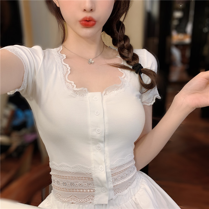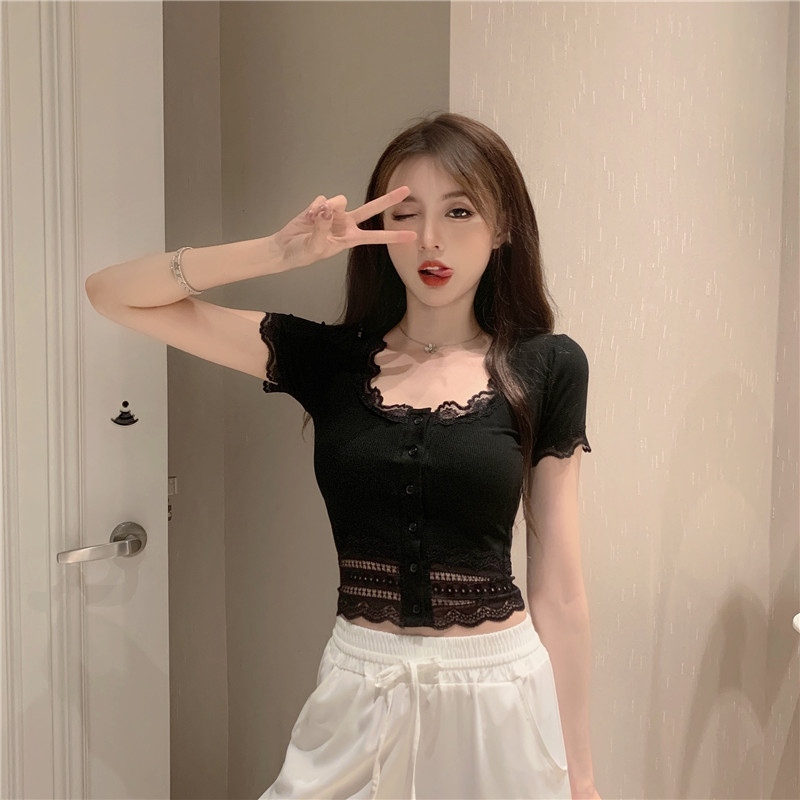 Black lace high waist short umbilical top women's watch out for machine summer sexy square collar ice silk sweater short sleeve t-shirt