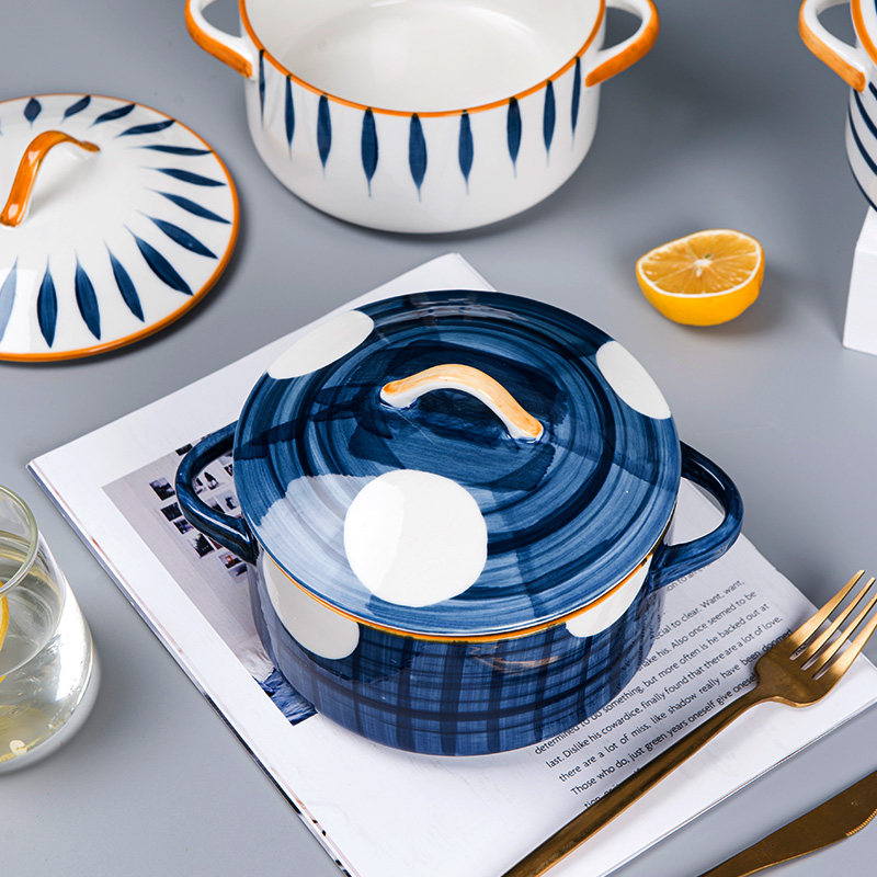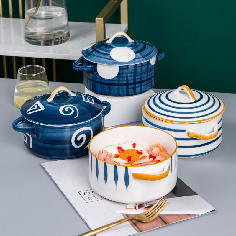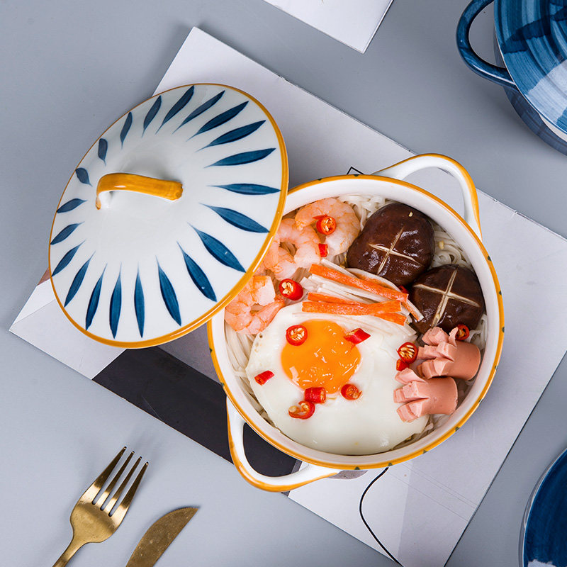Japanese-style ceramic double-eared household soup pot with cover large soup bowl instant noodle bowl Nordic creative tableware microwave oven