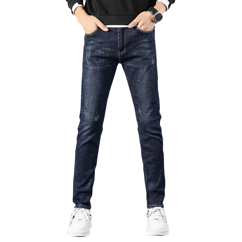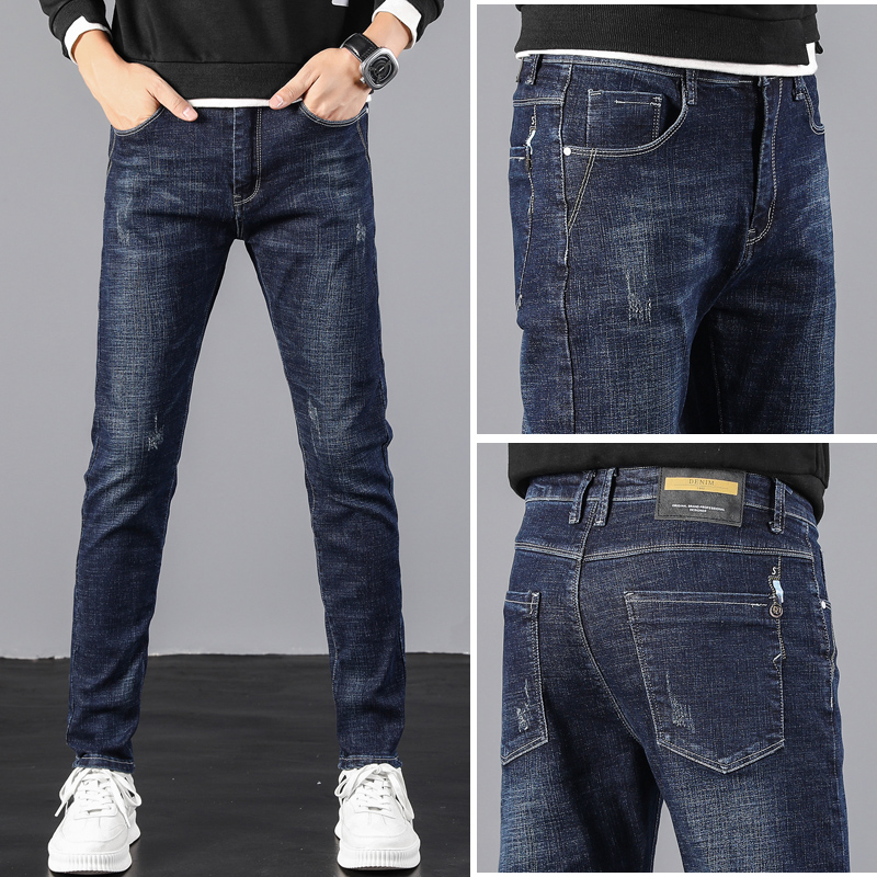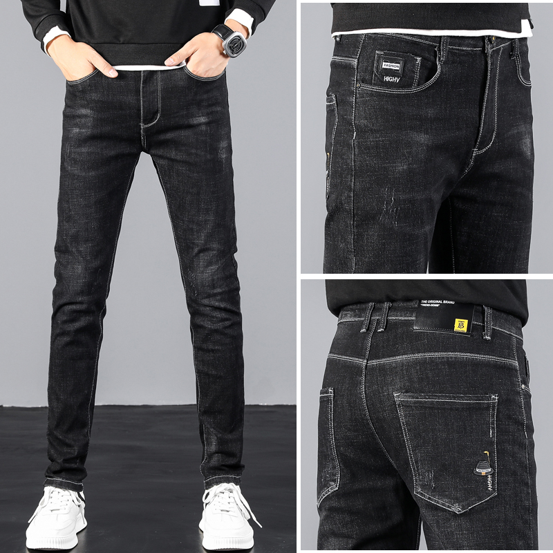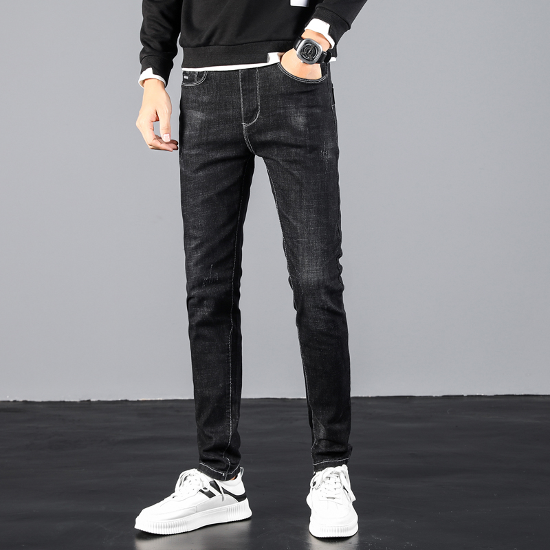 2021 New Men's Jeans Men's Spring and Autumn Straight Slim Fit Autumn Elastic Narrow Pants Tide Brand Plus Velvet Thickening