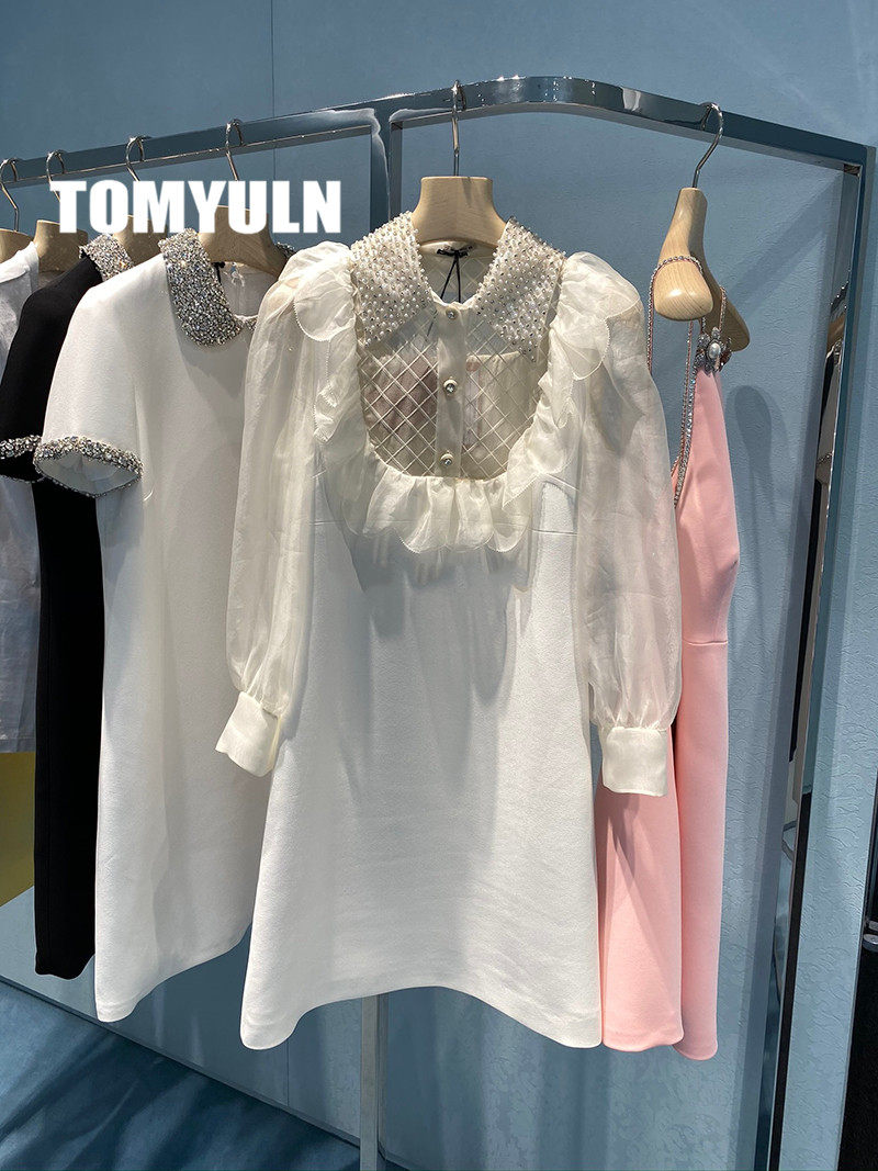 TOMYULN light luxury women's 20 autumn elegant ladies temperament mesh beaded silk long-sleeved dress