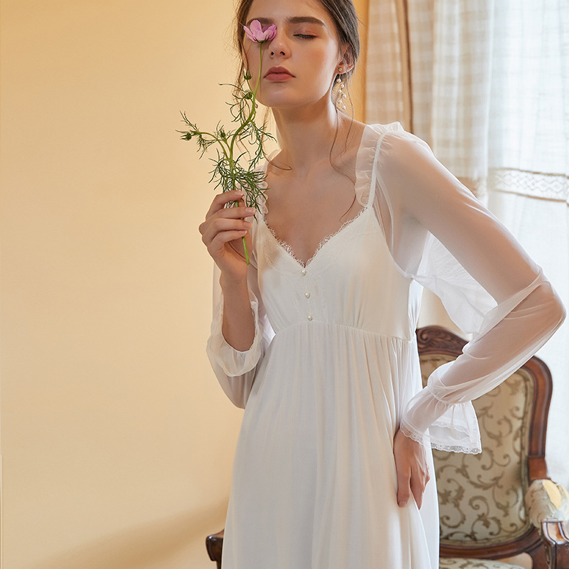 Very Fairy White Sleeping Dress Spring Autumn Long Dress Ankle Palace Court Wind Super Fairy Sweet Princess Sexy Pyjamas Woman Summer Long Sleeve
