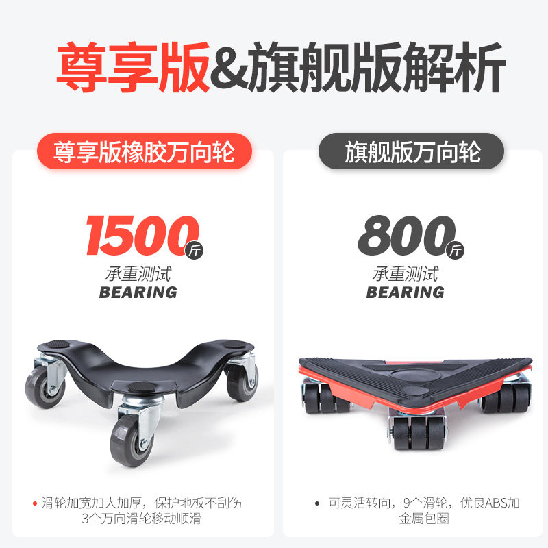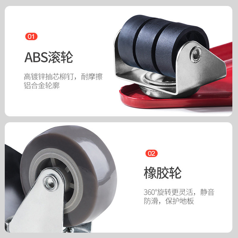 4 skateboards (load-bearing 450 kg) excluding crowbars One-way basic model (load-bearing 450 kg + upgrade crowbar) Soft rubber base model (load-bearing 450 kg + protective wood floor soft rubber wheel + upgrade crowbar) One-way soft glue upgrade model (load-bearing 700 kg + wooden floor universal) Small furniture model (load-bearing 700 kg + upgrade crowbar + anti-slip flange) Soft rubber small furniture model (load-bearing 700 kg + upgrade crowbar + soft rubber wheel + anti-slip flange) Medium-sized furniture model (load-bearing 1000 kg + universal wheel) Furniture universal Soft glue medium furniture model ( Weight-bearing 1000 kg + soft glue universal wheel) furniture general soft glue reinforcement model (load bearing 1200 kg + soft glue universal wheel) furniture universal reinforcement model (load bearing 1200 kg + universal wheel) furniture universal furniture general model (load bearing 1400 kg + cardan wheel) soft rubber furniture general model (load bearing 1400 kg + soft glue universal wheel) furniture universal brake large furniture model (load bearing 2800 kg + soft glue universal wheel + brake fixed) furniture universal enlarged universal model (load bearing 1400 kg + universal wheel) furniture universal brake general model ( Load-bearing 1400 kg + soft glue universal universal Hercules model (load bearing 2000 kg + soft glue universal wheel) furniture universal Brake Hercules model (load bearing 2600 kg + soft glue universal wheel + brake fixation) furniture universal large furniture model (load bearing 2800 kg + soft glue universal wheel) Classic 9 wheels (load bearing 900 kg + upgraded crowbar + universal wheel) furniture universal large foot furniture model (load bearing 2100 kg + soft glue universal wheel) foot furniture heavy furniture (load bearing 2600 kg + Soft rubber wheel wood flooring universal) anti-slip mat (10 pieces)