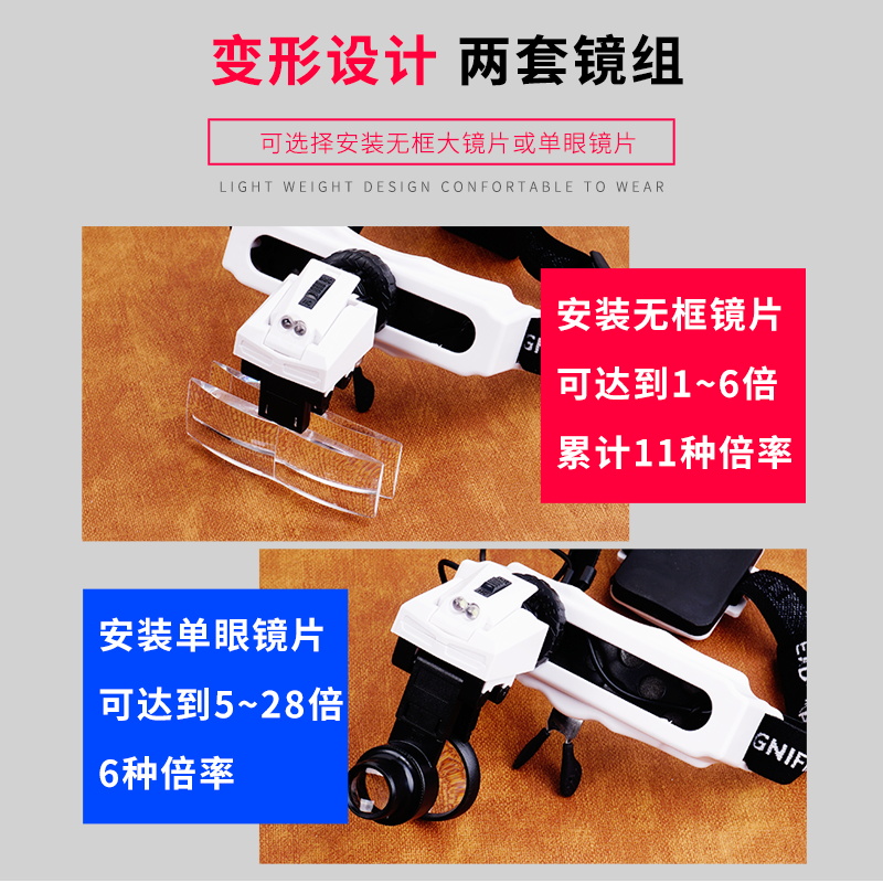 The Byster wearing a magnifying glass 28 times the elderly student reads the electronic maintenance of the beautiful mascara and the light source is clear