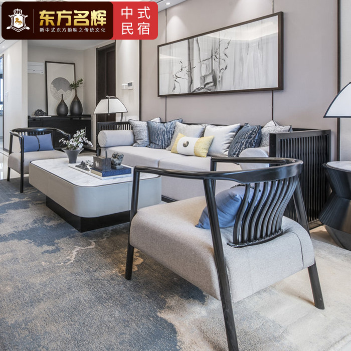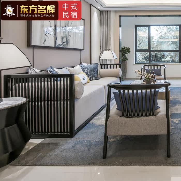 New Chinese style Zen sofa living room model room solid wood three-person sofa simple modern hotel villa fabric furniture