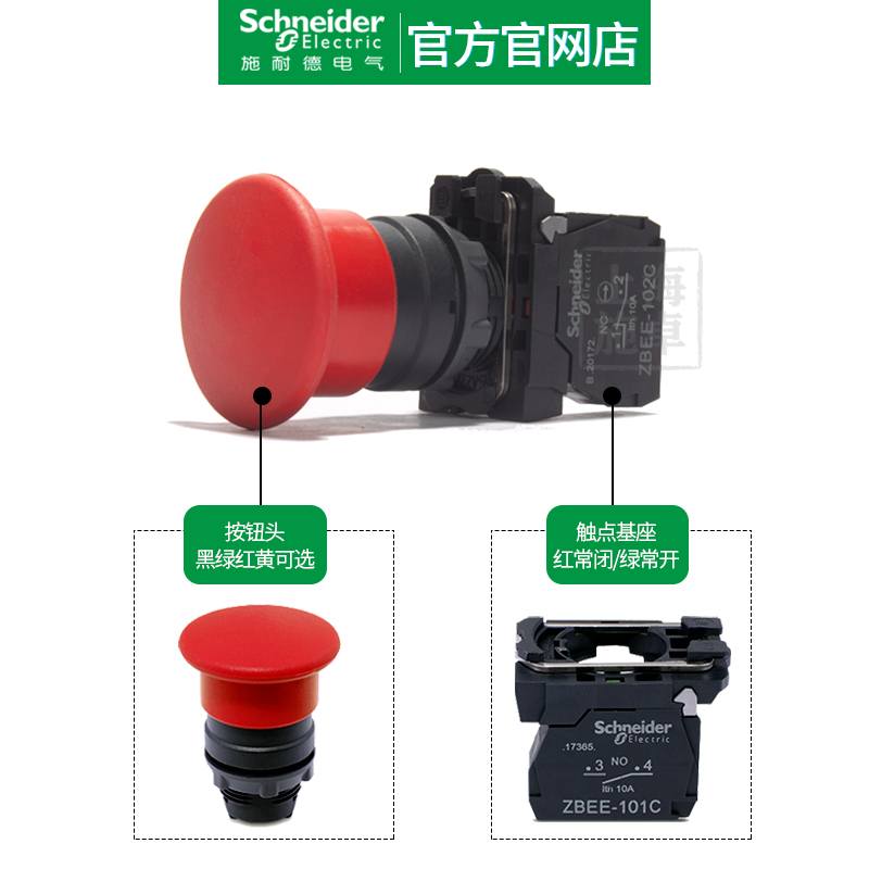 Schneider mushroom head button XB5AC31C green red yellow black self-reset 1 normally open 22mm plastic 1 normally closed