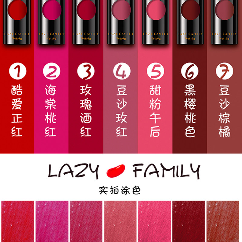 1#酷爱正红 2#海棠桃红 3#玫瑰酒红 4#豆沙玫粉 5#甜粉午后 6#黑樱桃色 7#珊瑚棕橘
