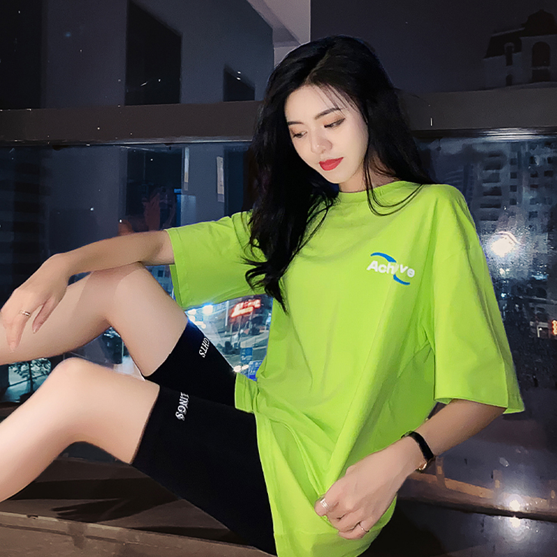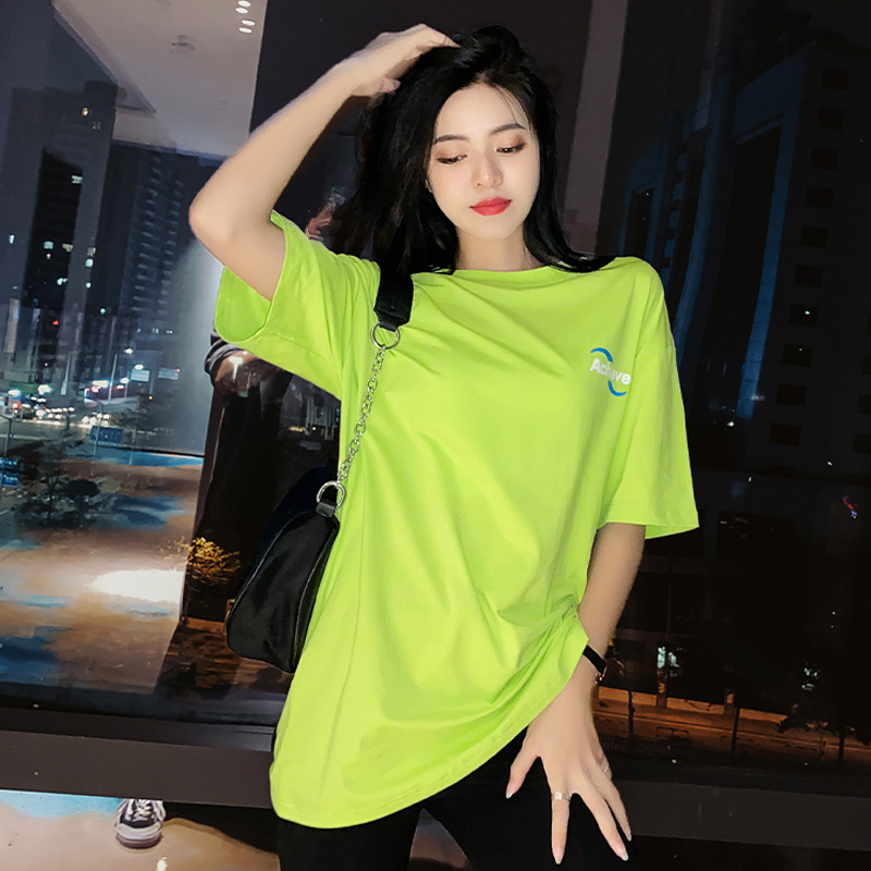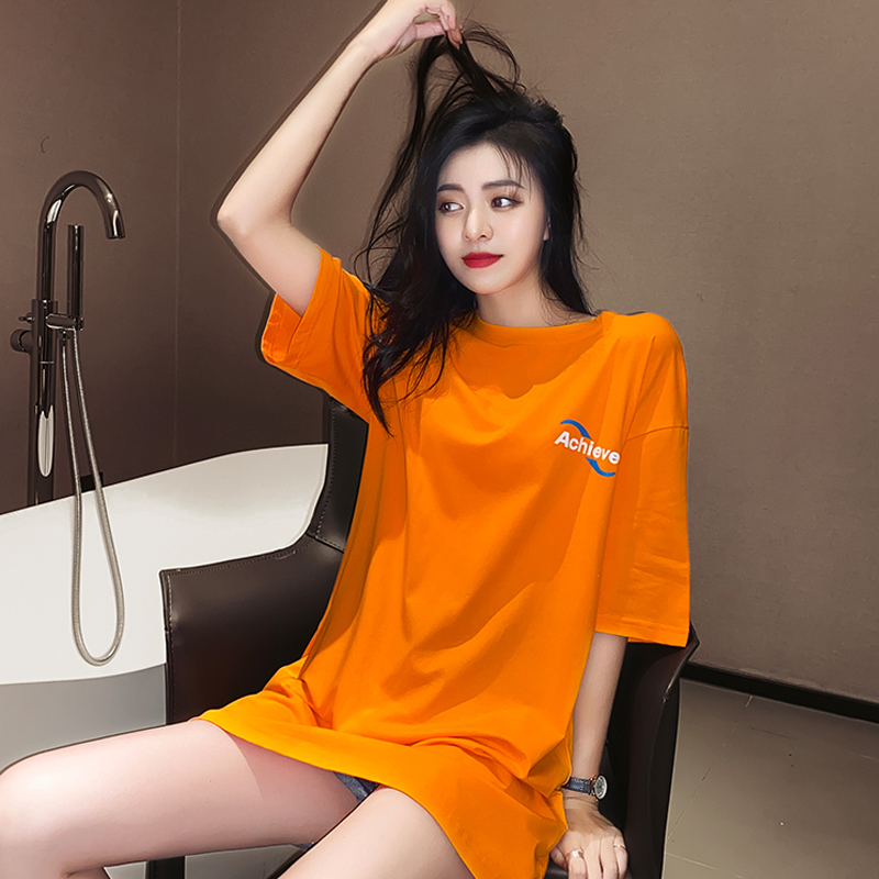 Tide brand orange short-sleeved t-shirt women's 2021 summer new mid-length bottoms missing loose cotton tops T-shirts