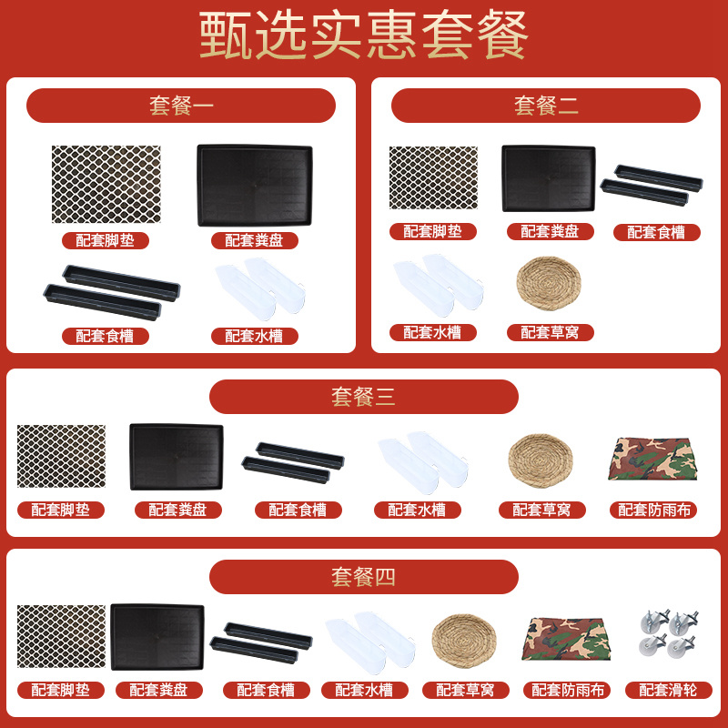 Package 1 (feces tray 2 pairs of troughs and floor mats package 2 (package 1 grass nest) package 3 (package 1 grass nest rainproof cloth) package 4 (package 1 grass nest rainproof cloth wheels